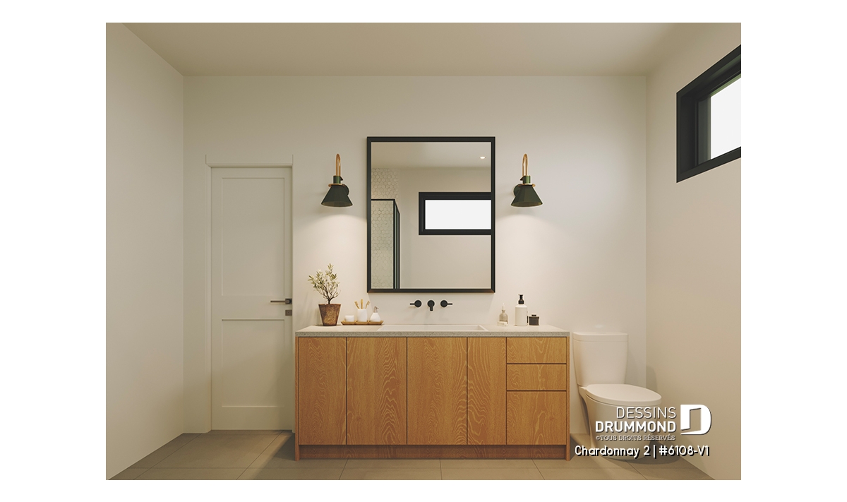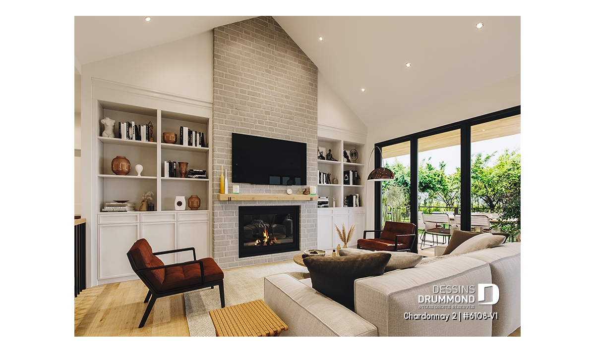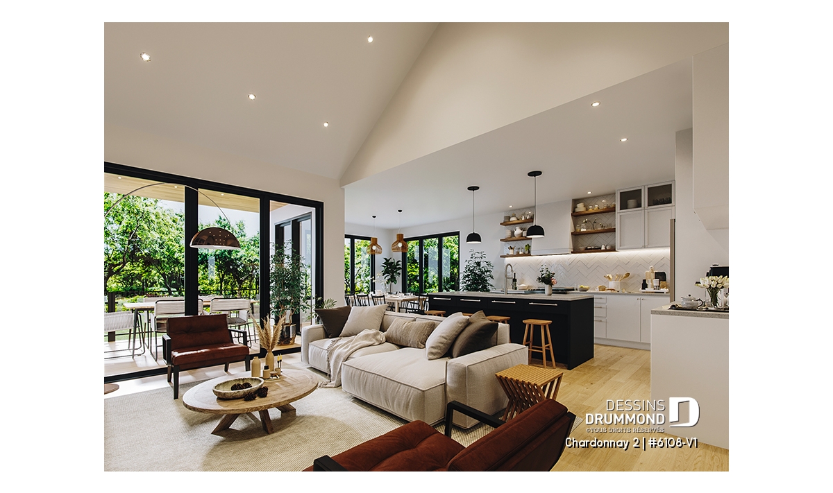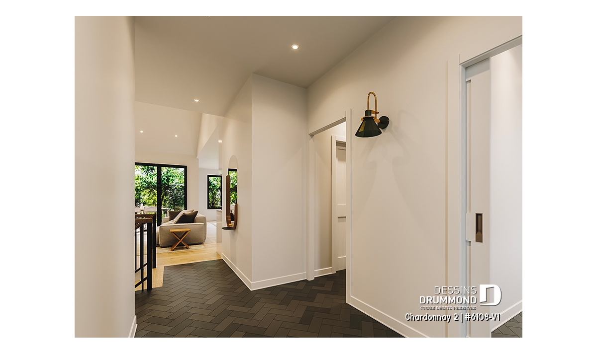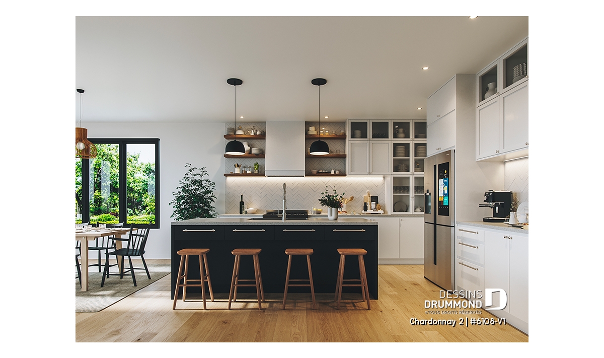 Le plan de maison Chardonnay 2 (#6108-V1) propose 1487 pi.ca. aménagés sur un seul plancher. Ce plan de type plain-pied avec garage de style Moderne Scandinave propose un look épuré tout en maximisant les espaces intérieurs et extérieurs, tel le balcon avant et la terrasse arrière qui sont tous les deux abrités.