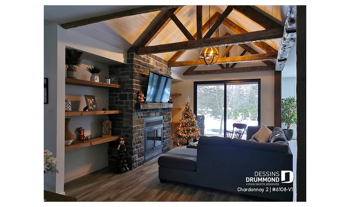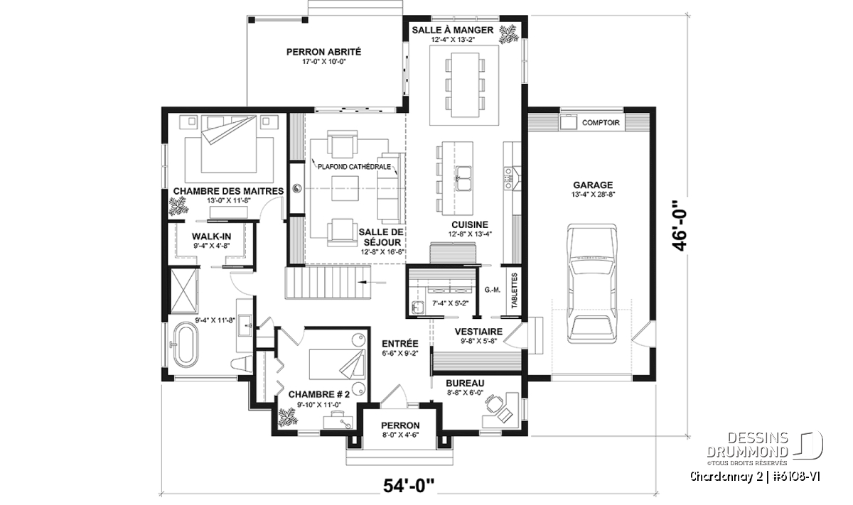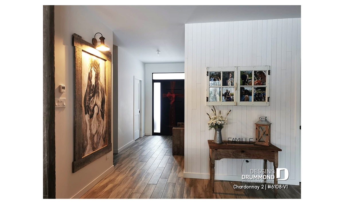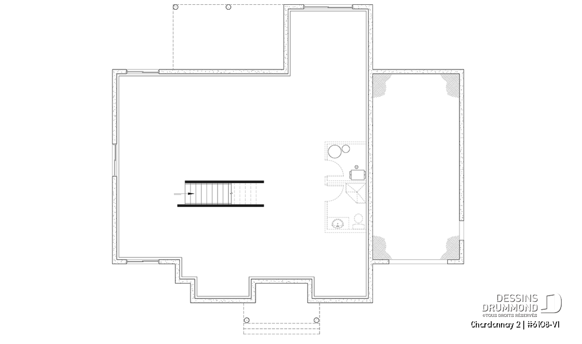 Cette magnifique maison propose aussi un garage avec coin atelier, ainsi que d’un sous-sol à aménager selon vos besoins familiaux, mais noter que d'autres types de fondation sont également disponibles. Ce plan est aussi disponible sans garage, voir le plan Chardonnay (# 6108) qui propose un garage en plus de quelques modifications intérieures.