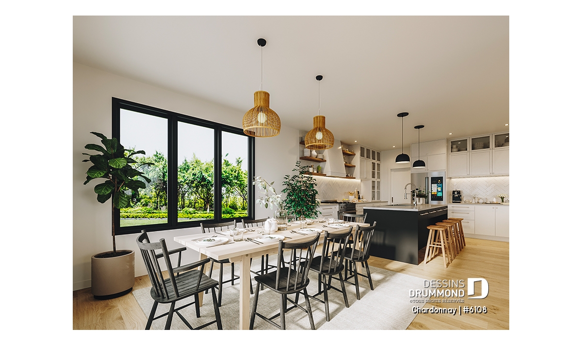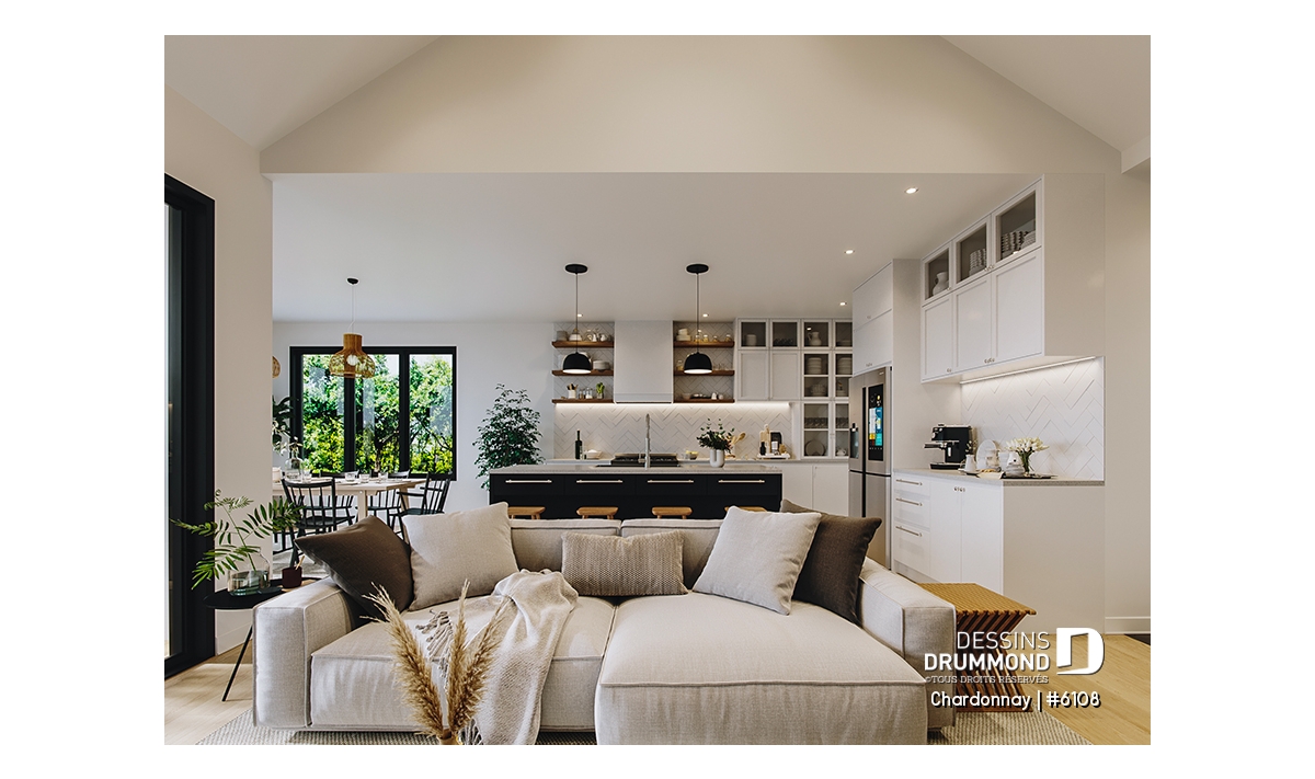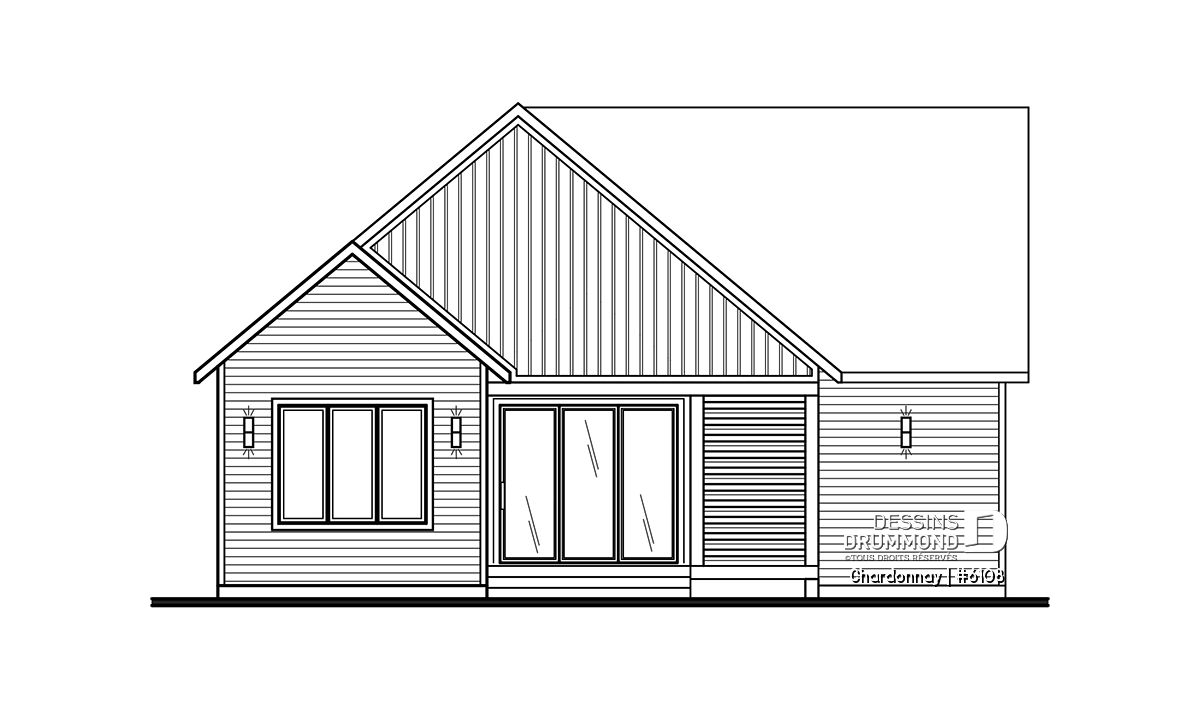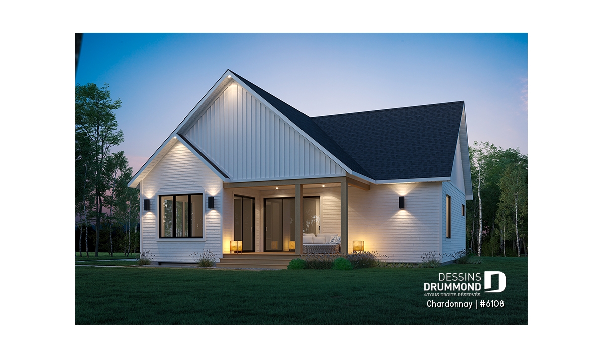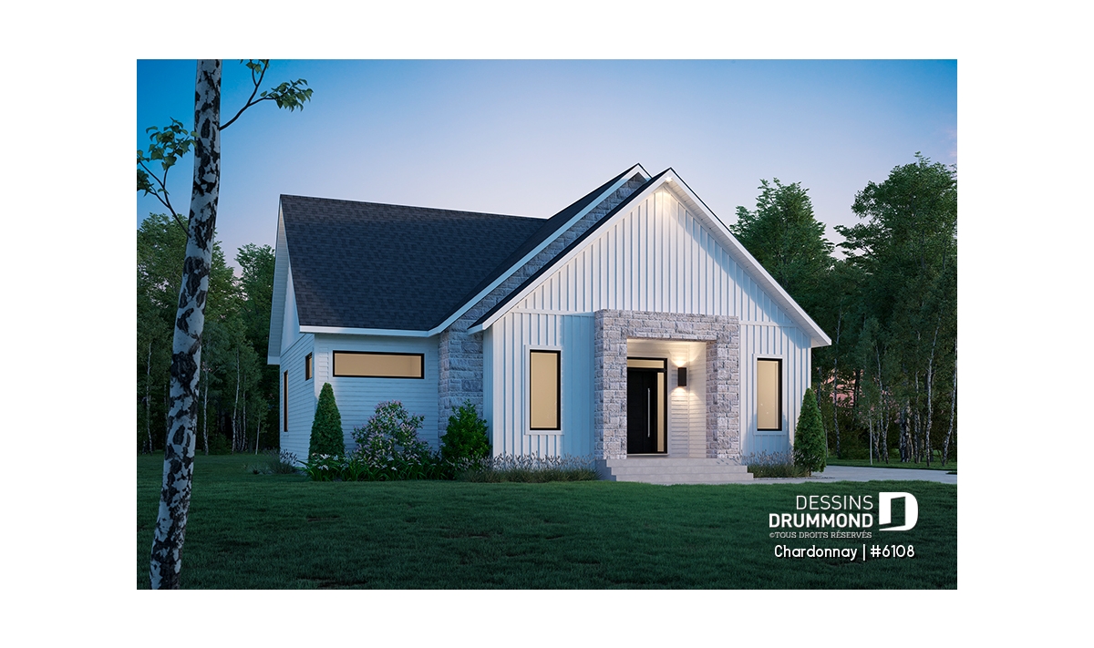 Le plan de maison Chardonnay (#6108) propose 1487 pi.ca. aménagés sur un seul plancher. Ce plain-pied de style Scandinave offre un look épuré tout en maximisant les espaces intérieurs et extérieurs, tels le balcon avant et la terrasse arrière qui sont tous les deux abrités.