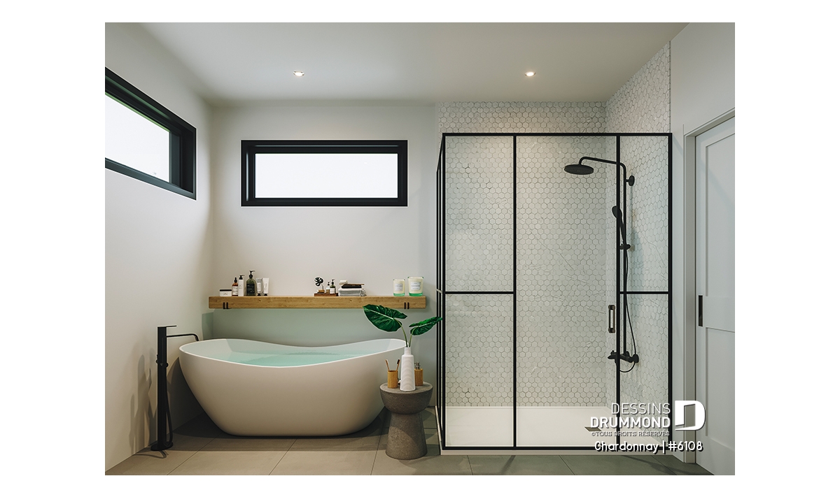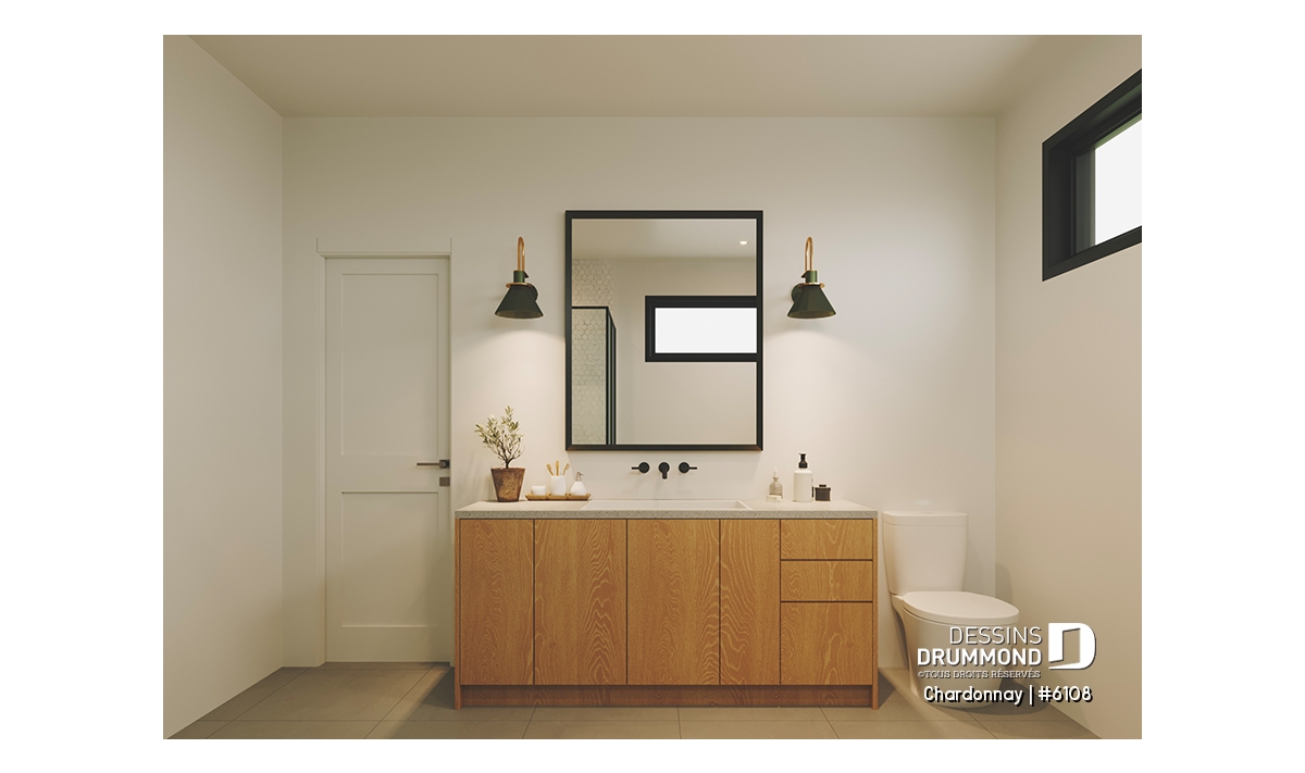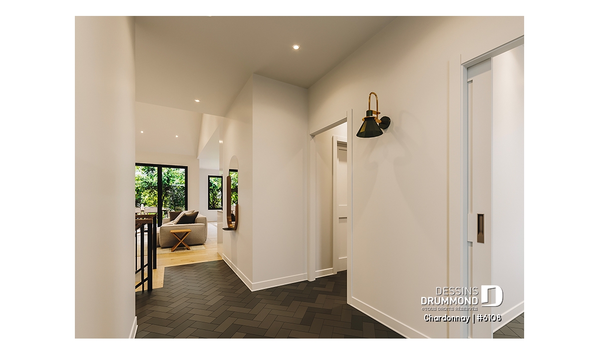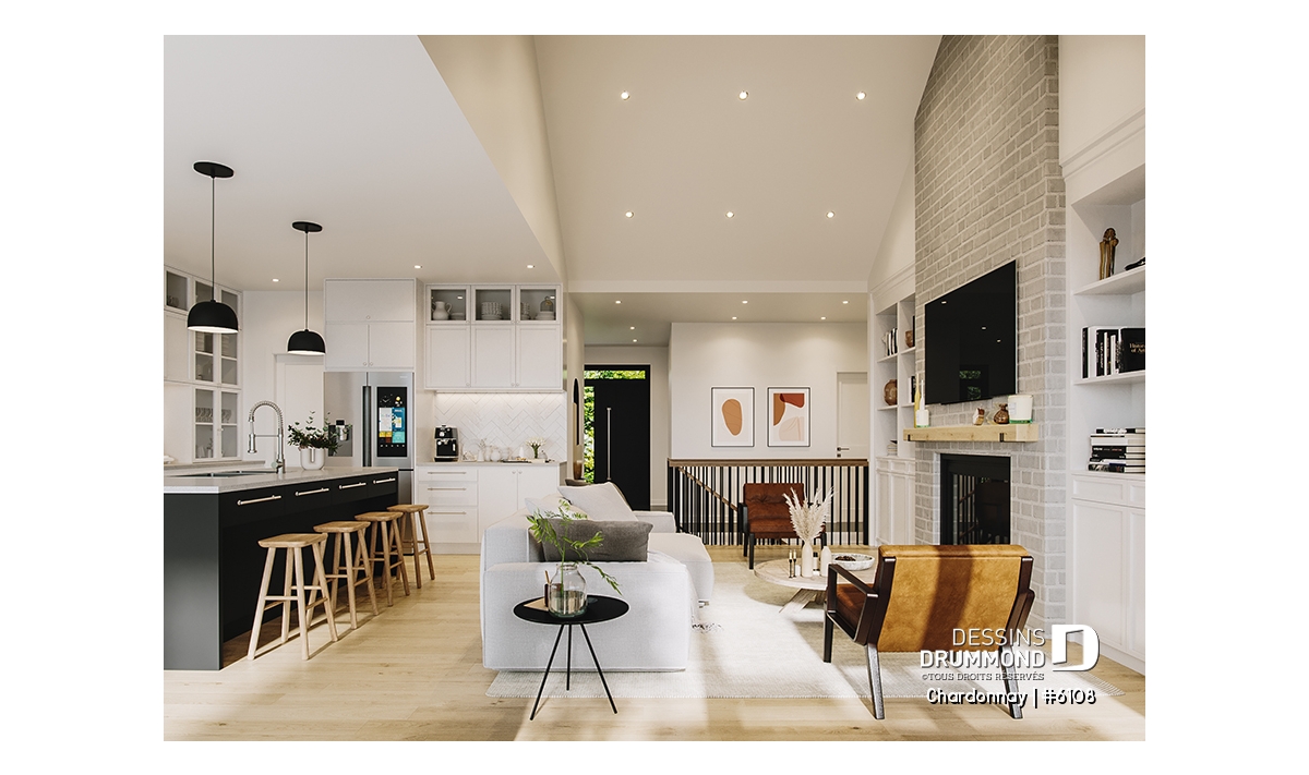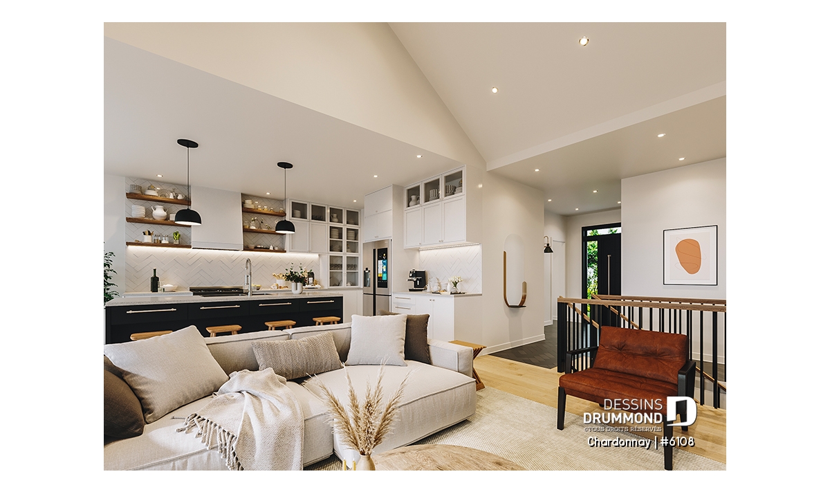 Le plan de maison Chardonnay (#6108) propose 1487 pi.ca. aménagés sur un seul plancher. Ce plain-pied de style Scandinave offre un look épuré tout en maximisant les espaces intérieurs et extérieurs, tels le balcon avant et la terrasse arrière qui sont tous les deux abrités.