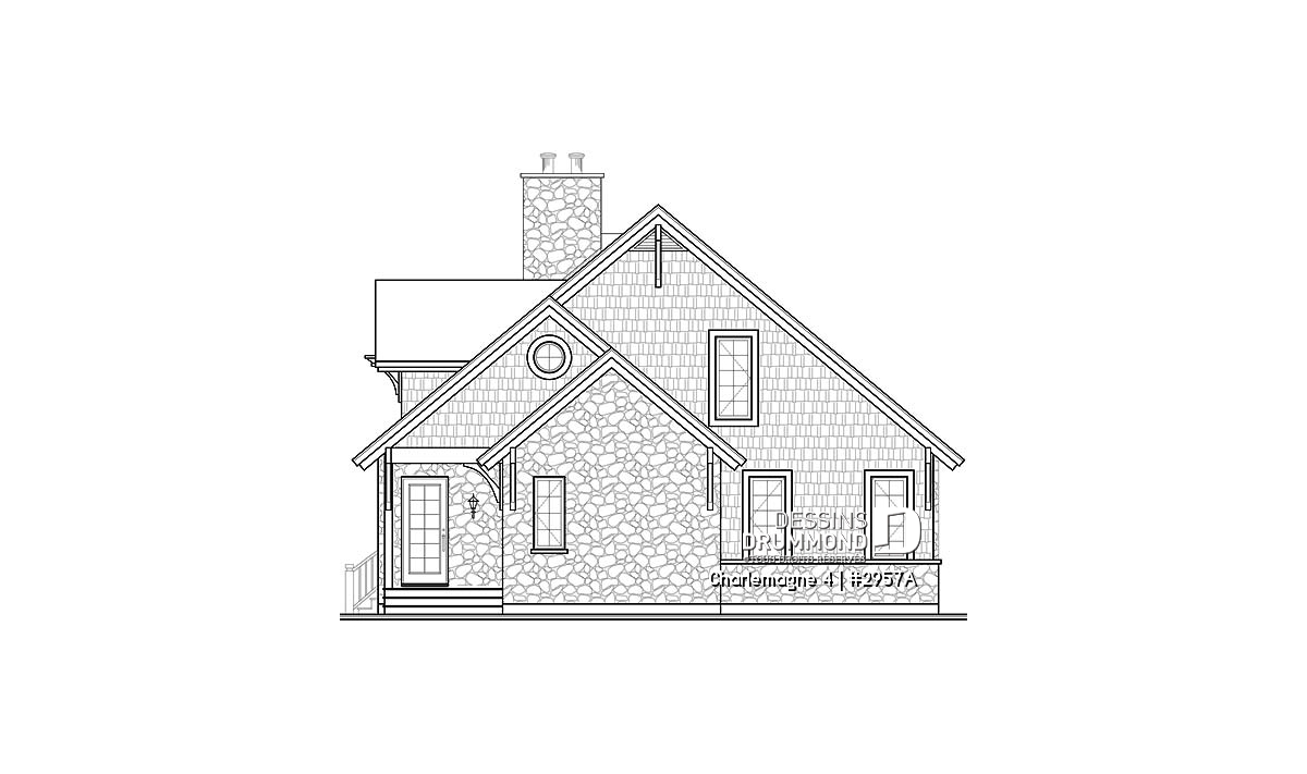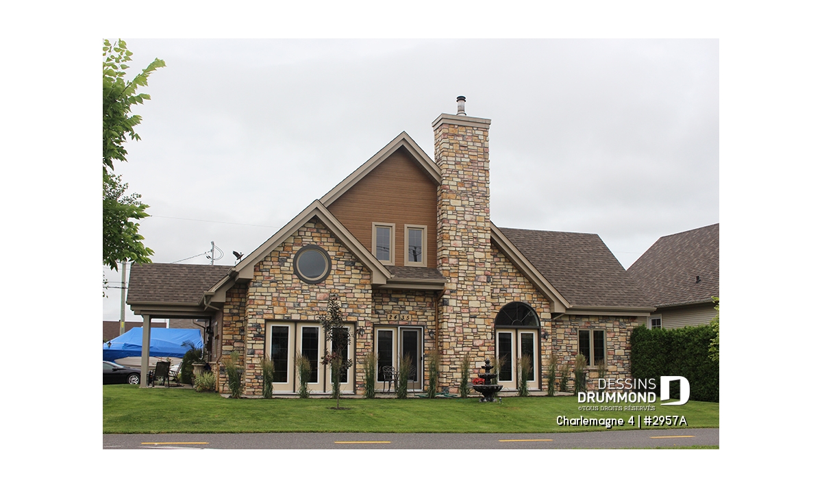 Nous voici dans le vestibule, caractérisé par un grand rangement, indispensable à une telle demeure. Passé celui-ci, un bel espace salle de séjour, un foyer central, des portes françaises et un plafond cathédrale retiennent notre attention en plus de cette lucarne qui alimente de lumière l’escalier. Plus loin, une grande cuisine permet l’insertion d’une table pour au moins six convives avec vue arrière assurée par un volume abondamment fenêtré et en saillie. Toujours sur ce plancher, une chambre des maîtres, avec vue partielle sur l’arrière, bénéficie d’un grand rangement et côtoie une salle de bain complète.