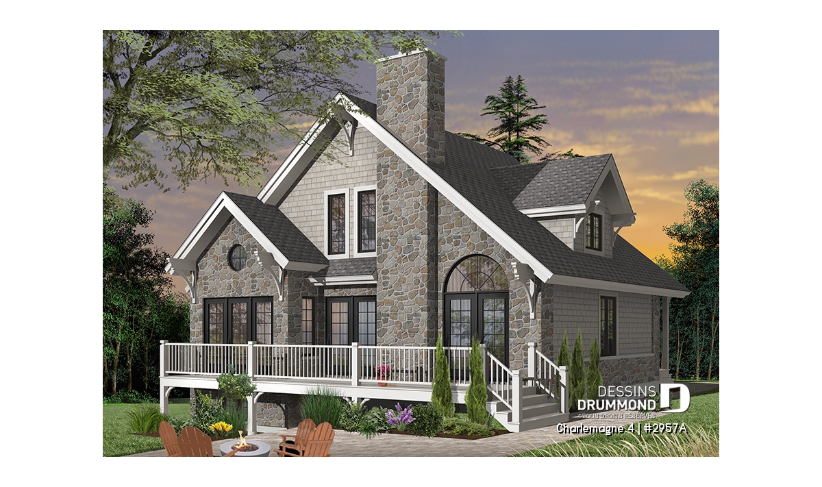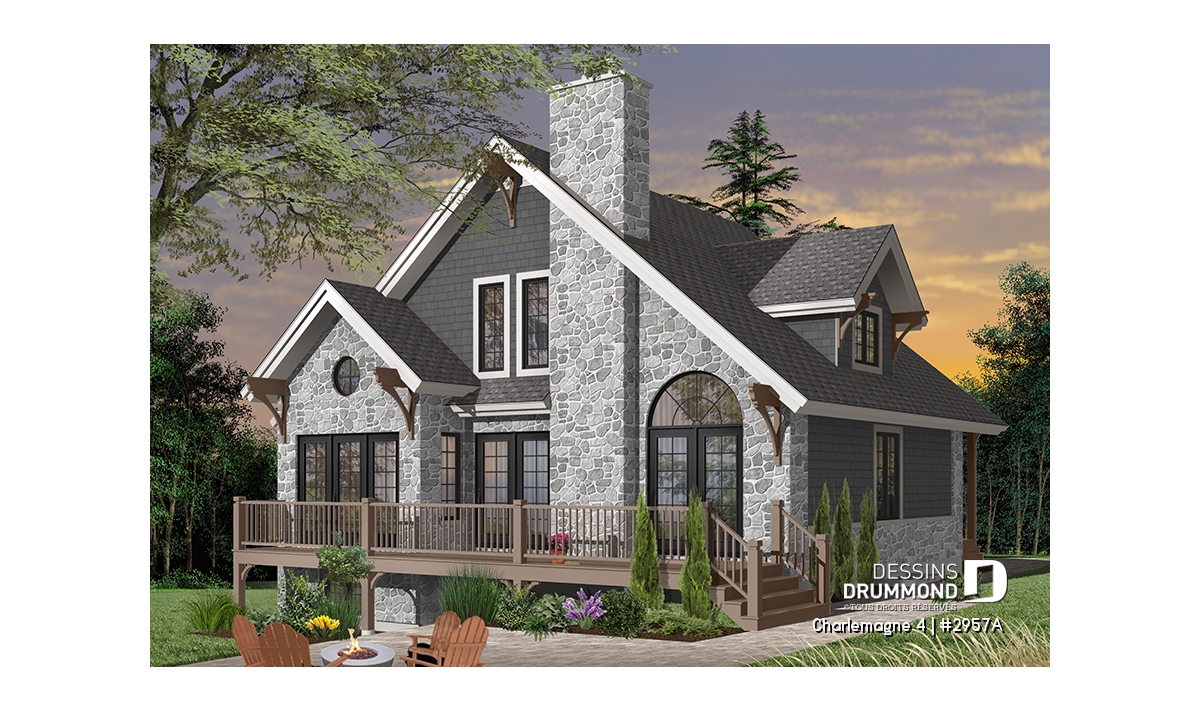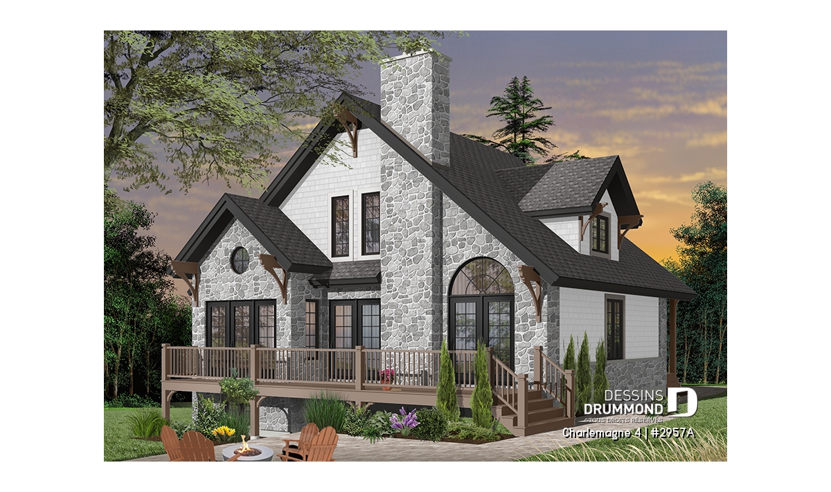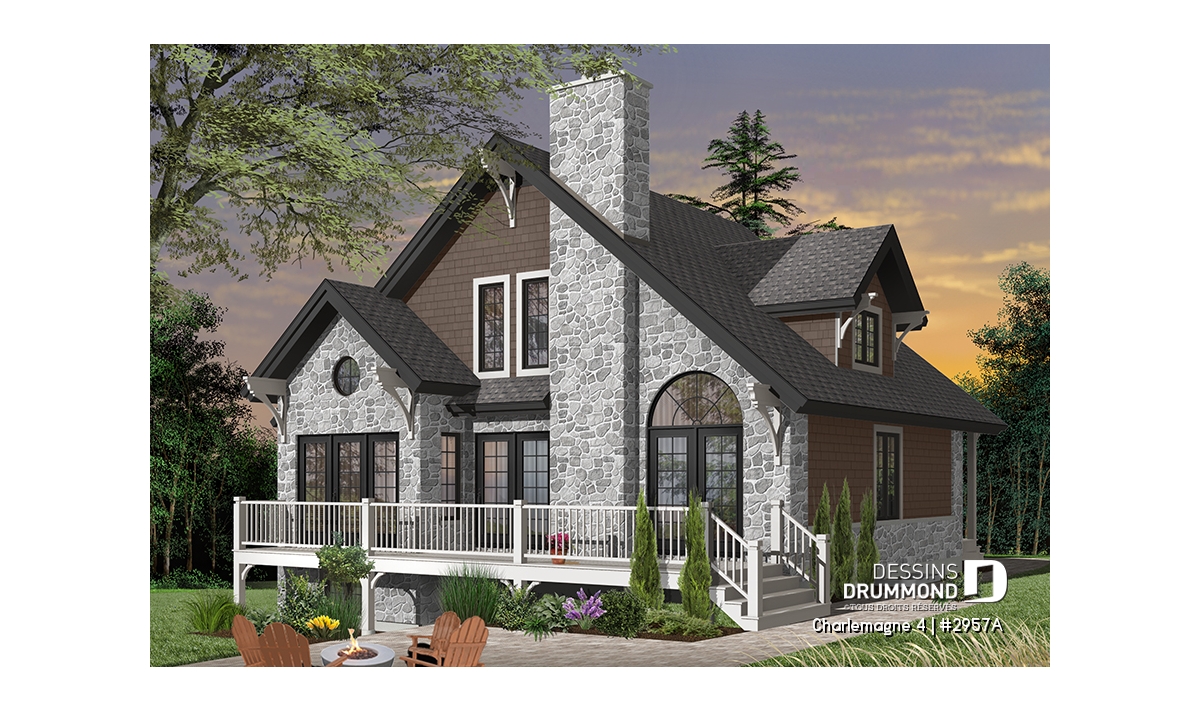 Plan de chalet rustique, 3 chambres, plafond cathédrale, foyer, grand balcon arrière, mezzanine