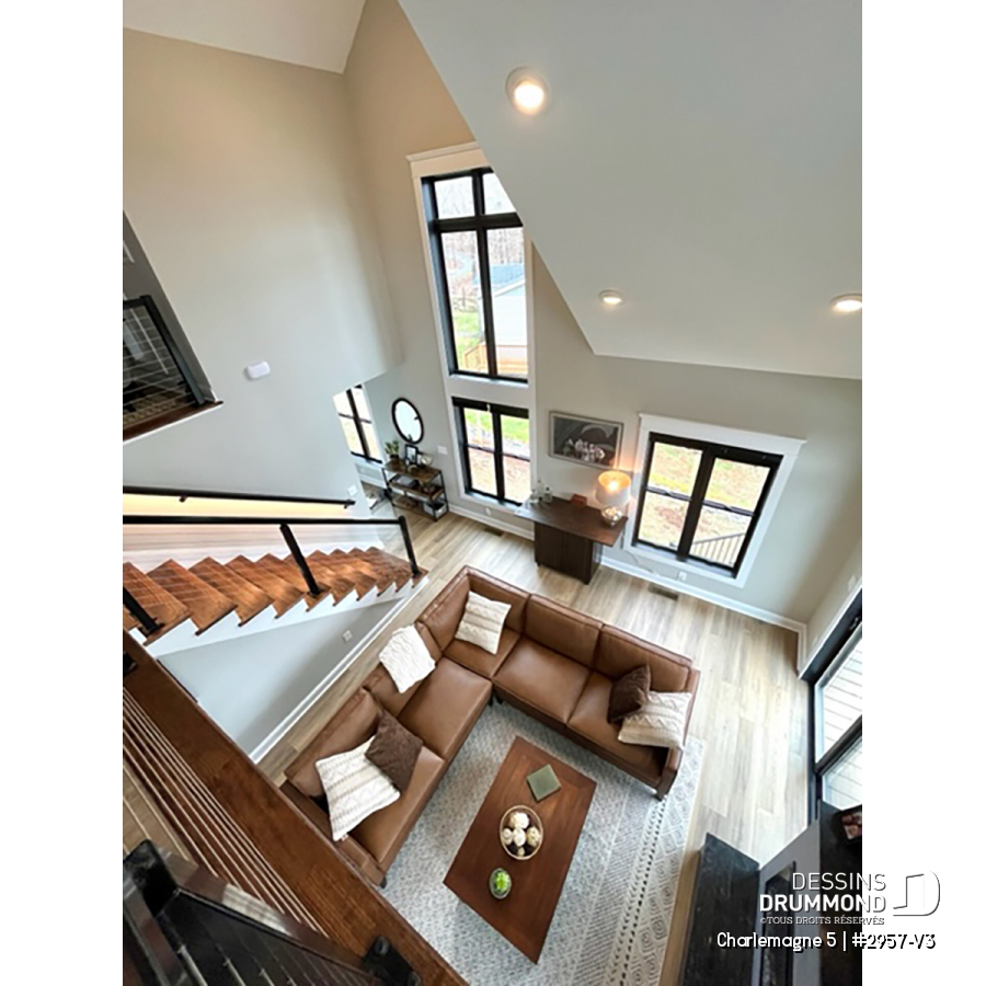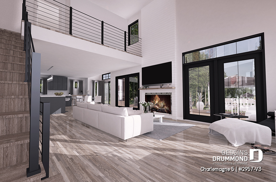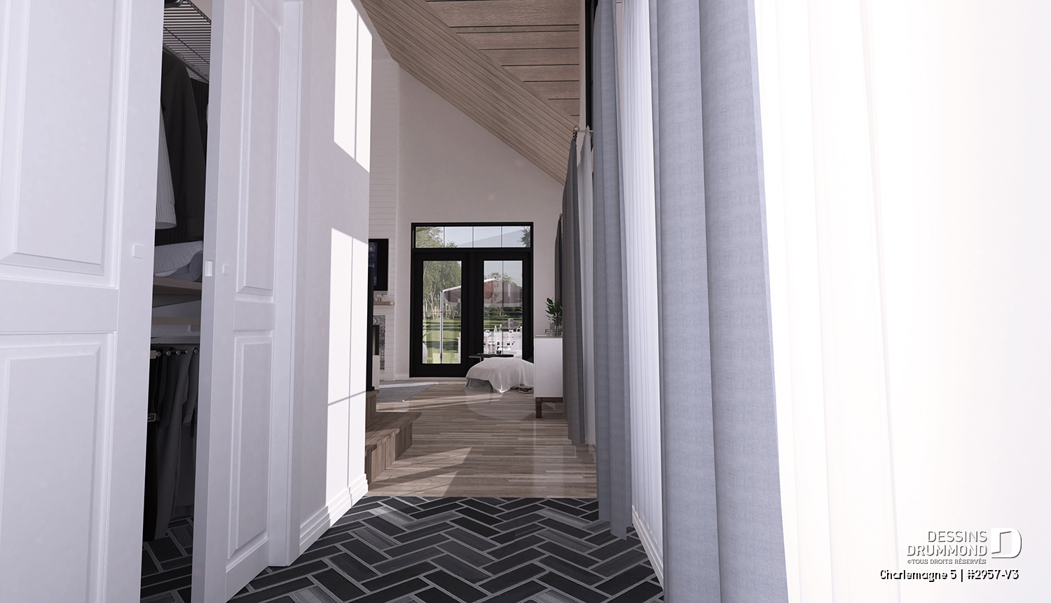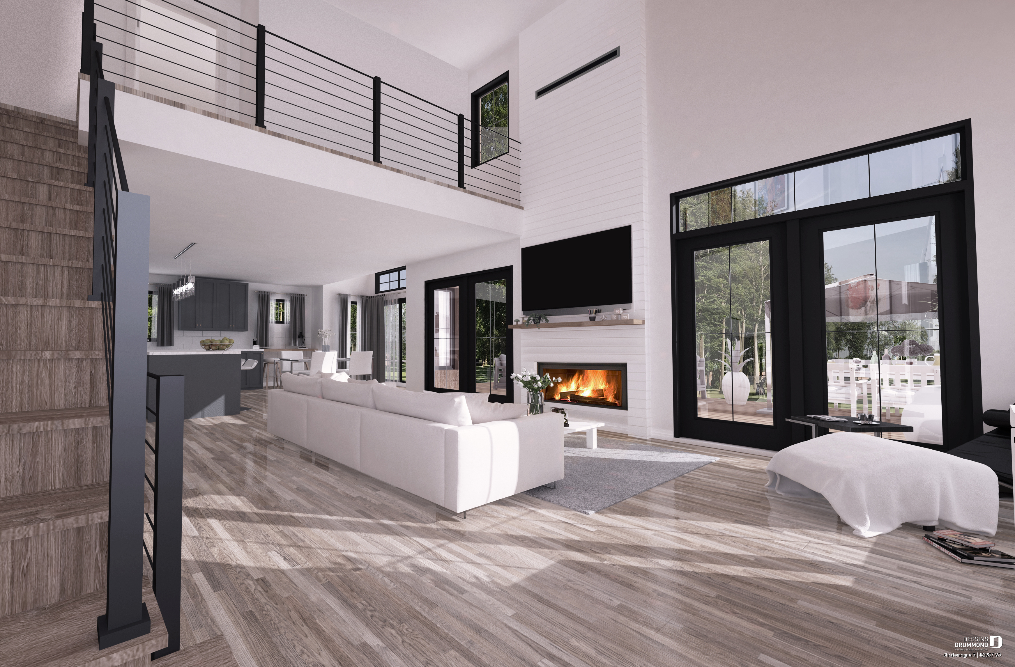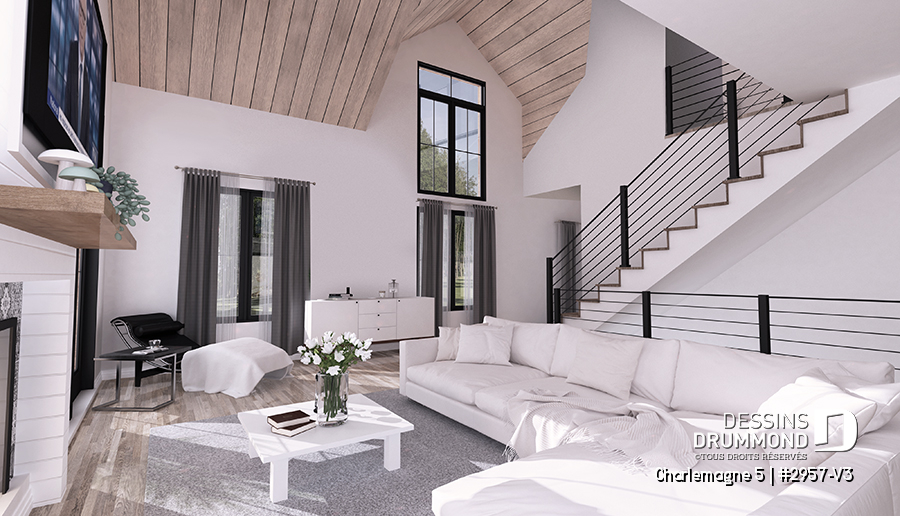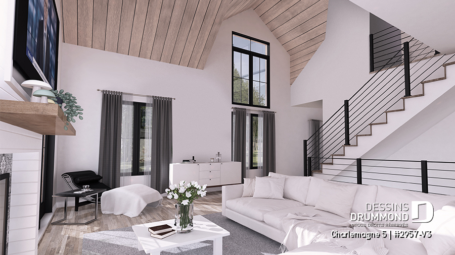 Cependant, si des poutres ou moulures de bois ou imitation de bois sont installées dans un plafond cathédral (sur nos illustrations ou photos), elles ne sont pas incluses dans les estimations. À noter que les poutres de bois illustrées sur l'extérieure de nos maisons sont incluses dans le coût, mais elles sont «capées » et non en bois massif.