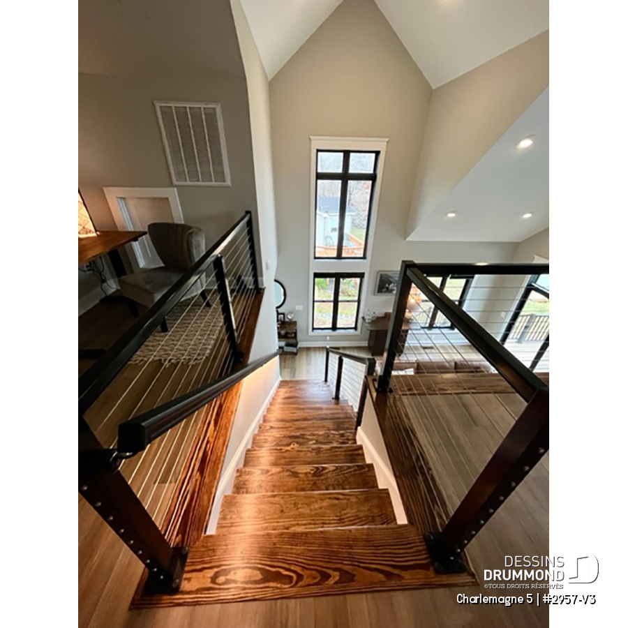 Les escaliers montants à l'étage sont en bois franc et ceux descendants vers le sous-sol sont en particule de bois (ou tapis).