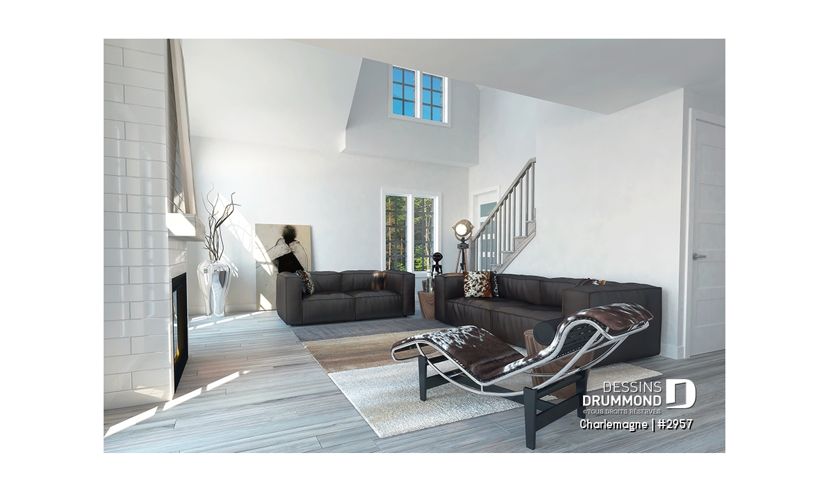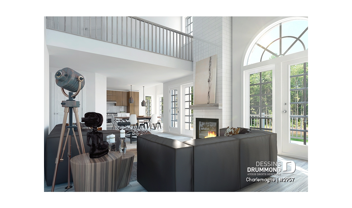 Salle de séjour majestueuse avec plafond cathédrale de plus de 17', foyer chaleureux et fenestration abondante.