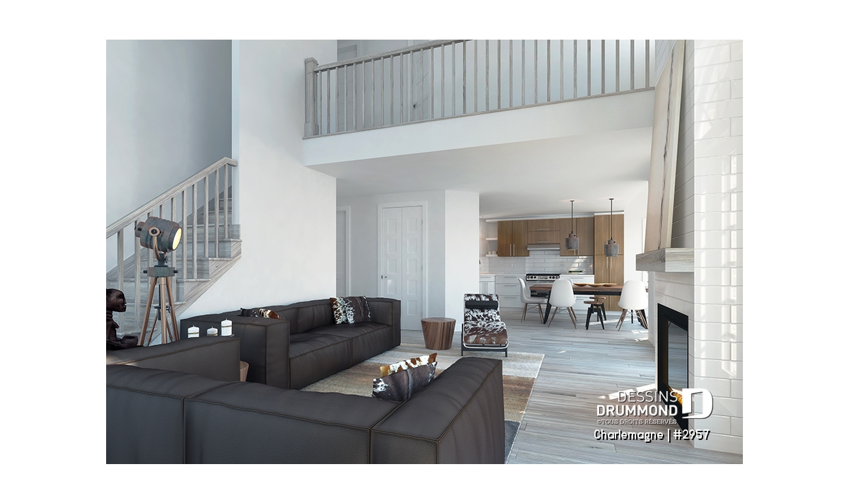 Dès l’entrée, un vestibule généreux doté d’une grande garde-robe assure un accueil fonctionnel, parfait pour y déposer manteaux, bottes et équipements sportifs. On découvre ensuite une salle de séjour spectaculaire où un plafond cathédrale de plus de 17 pieds, un foyer réconfortant et une fenestration abondante créent une ambiance grandiose. La lumière naturelle s’invite de tous côtés, tandis que la mezzanine à l’étage offre une vue imprenable sur l’espace principal, idéale pour aménager un coin lecture ou un espace créatif.