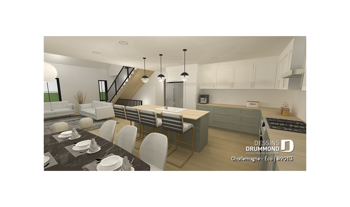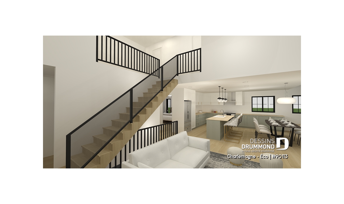 Conçue pour une orientation de la cour arrière au sud, cette maison conserve les caractéristiques marquantes de l’originale (Charlemagne 5, plan #2957-V3) tout en proposant de nouvelles idées plus optimales et écologiques. Tout d’abord, au rez-de-chaussée, nous retrouvons l’entrée suivie de la grande aire ouverte où se retrouvent la cuisine, la salle à manger et le salon. L’arrière de la maison est généreusement fenestré pour accueillir toute la lumière naturelle provenant du sud. Au-devant de la maison, il y a la suite des maîtres avec un walk-in et une salle de bain privée.