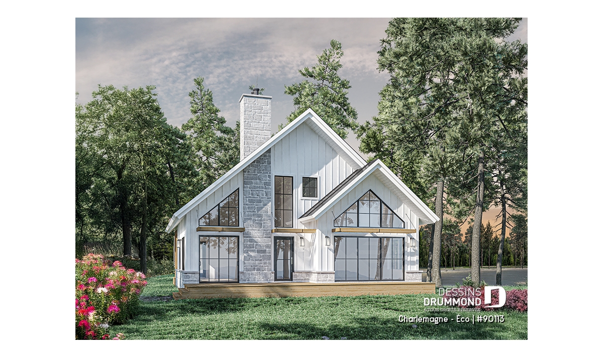 Vue arrière - MODÈLE DE BASE - Plan de chalet éco-responsable, vue panoramique, 3 à 5 chambres, cathédral, sous-sol aménagé (*optionnel $) - Charlemagne - Éco