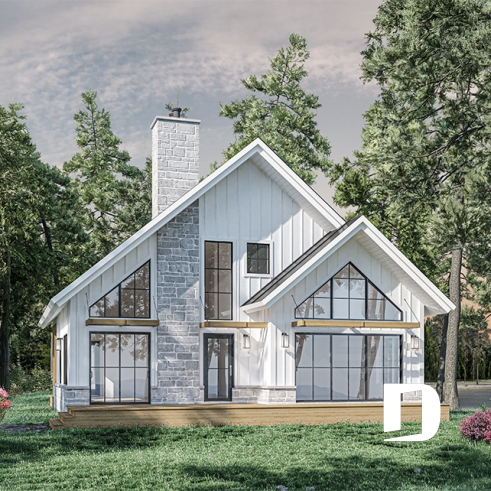 Plan de chalet éco-responsable, vue panoramique, 3 à 5 chambres, cathédral, sous-sol aménagé (*optionnel $)