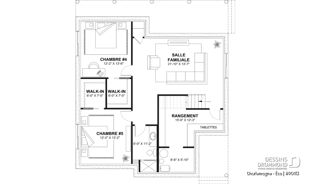 Sous-sol aménagé (Optionel $) - Plan de chalet éco-responsable, vue panoramique, 3 à 5 chambres, cathédral, sous-sol aménagé (*optionnel $) - Charlemagne - Éco