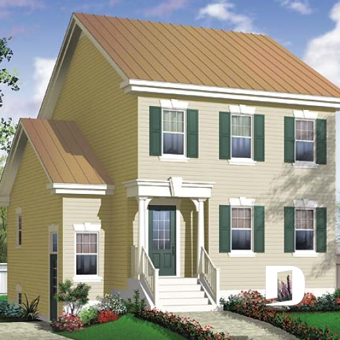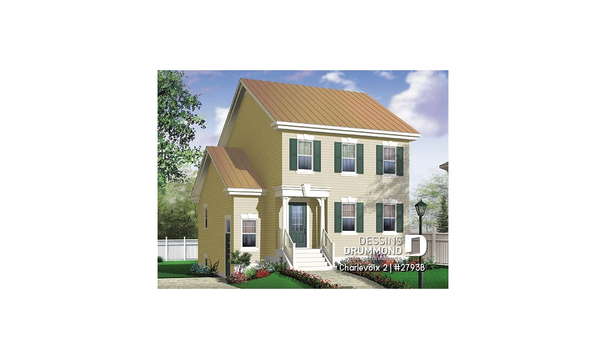 D’allure classique, ce plan propose une organisation des ouvertures typique des modèles anglais d’architecture monumentale ainsi qu’une toiture simplifiée et par le fait même facile à réaliser en tôle d’acier pré-peinte. On remarque, sur le côté gauche, une entrée de service permettant d’accéder au « bachelor » et, fait à noter, seulement six marches composent l’escalier d’accès étant donné que la maison est passablement hors terre pour bien dégager les fenêtres du sous-sol.