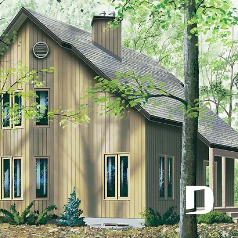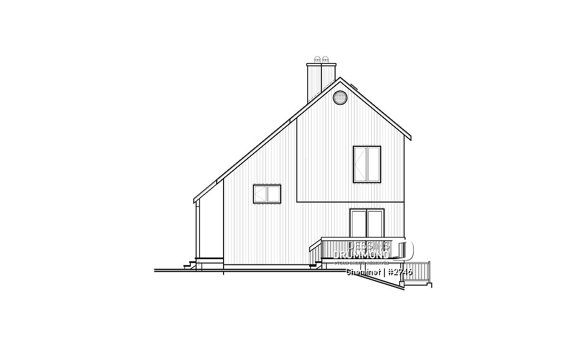 Plan de chalet d'inspiration scandinave, 2 chambres, salle familiale fermée, portes françaises, mezzanine