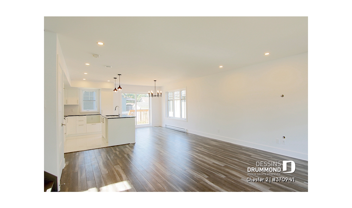 Secteur activités fenêtré sur trois façades, et porte patio à la salle à dîner.