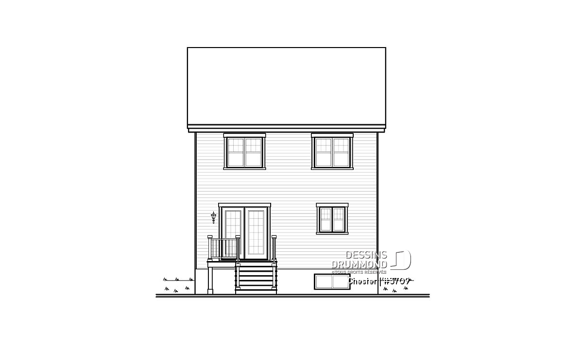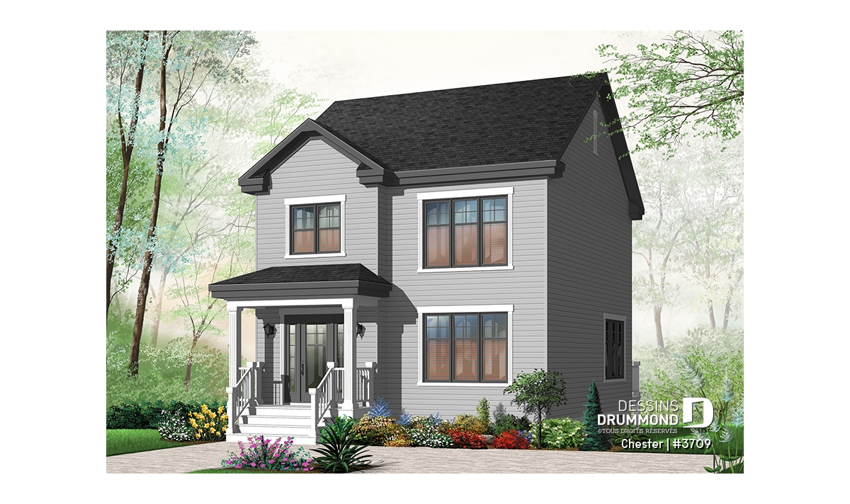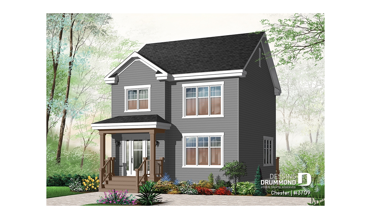 À l’extérieur, des lignes simples et un volume en saillie pour l’entrée avant procurent à ce cottage une allure passablement attrayante et un prix de revient l’étant tout autant.
