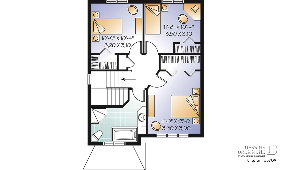 À l’étage, le surprenant confort de ce modèle se traduit par la présence de trois chambres de bonnes dimensions avec garde-robes fort adéquates et par une salle de bain avec bain indépendant de la douche en coin.
