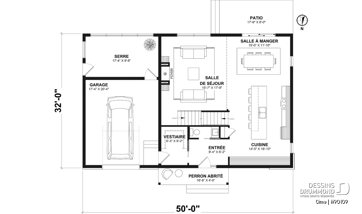 La conception de la maison CIME (#90109) a été effectuée selon un terrain dont la façade est située au Nord. En entrant dans la maison, nous nous retrouvons dans une entrée qui communique avec celle du garage et qui donne accès à un vestiaire de type « walk-in ». À cet étage, il y a aussi une salle d’eau, une très grande cuisine parfaite pour recevoir, une salle à manger double hauteur ainsi qu’un salon avec foyer et un plafond ouvert sur 2 étages.