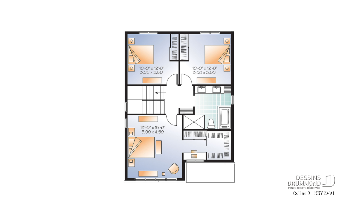 À l’étage, ce gain significatif se traduit par l’obtention de trois chambres pouvant loger chacune un lit double voire grand lit ou lit king à la chambre des maîtres. Ici, on apprécie une salle de bain complète avec vanité double et douche indépendante de 60’’ x 40’’ ainsi que deux garde-robes dont un walk-in à la chambre 1 dotée aussi d’un coin maquillage et/ou ordinateur. À découvrir !