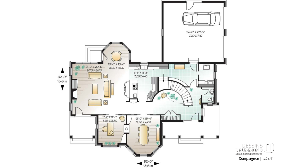 Plafond à 9 pi au rez-de-chaussée, dînette en solarium et foyer mitoyen entre la salle à manger et le bureau.
