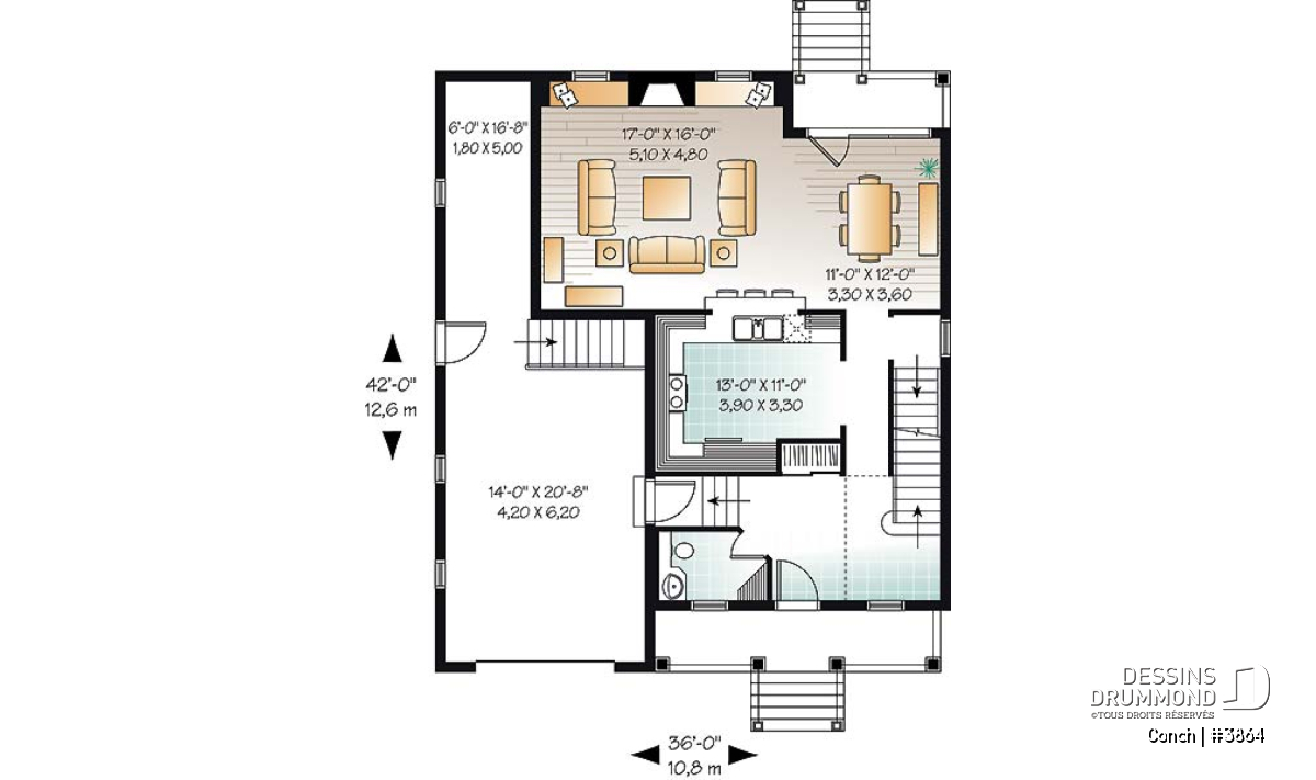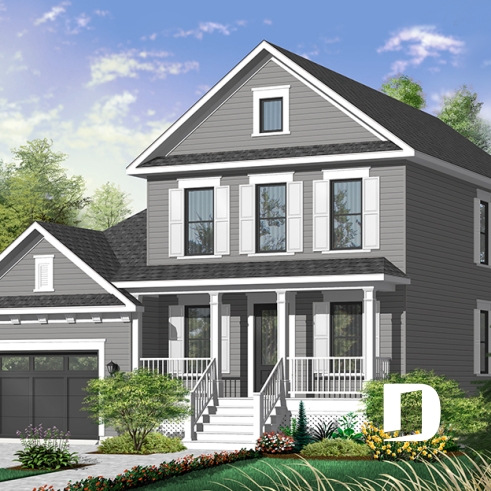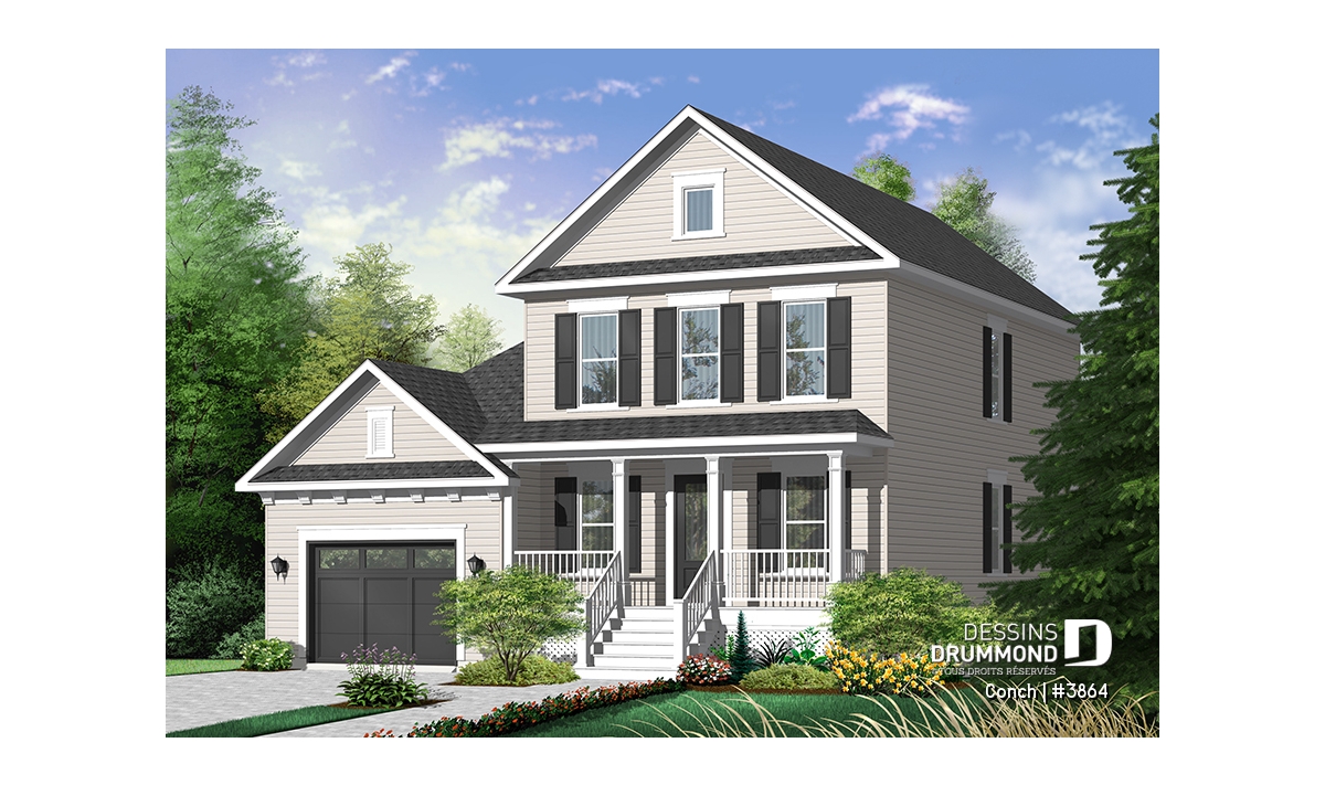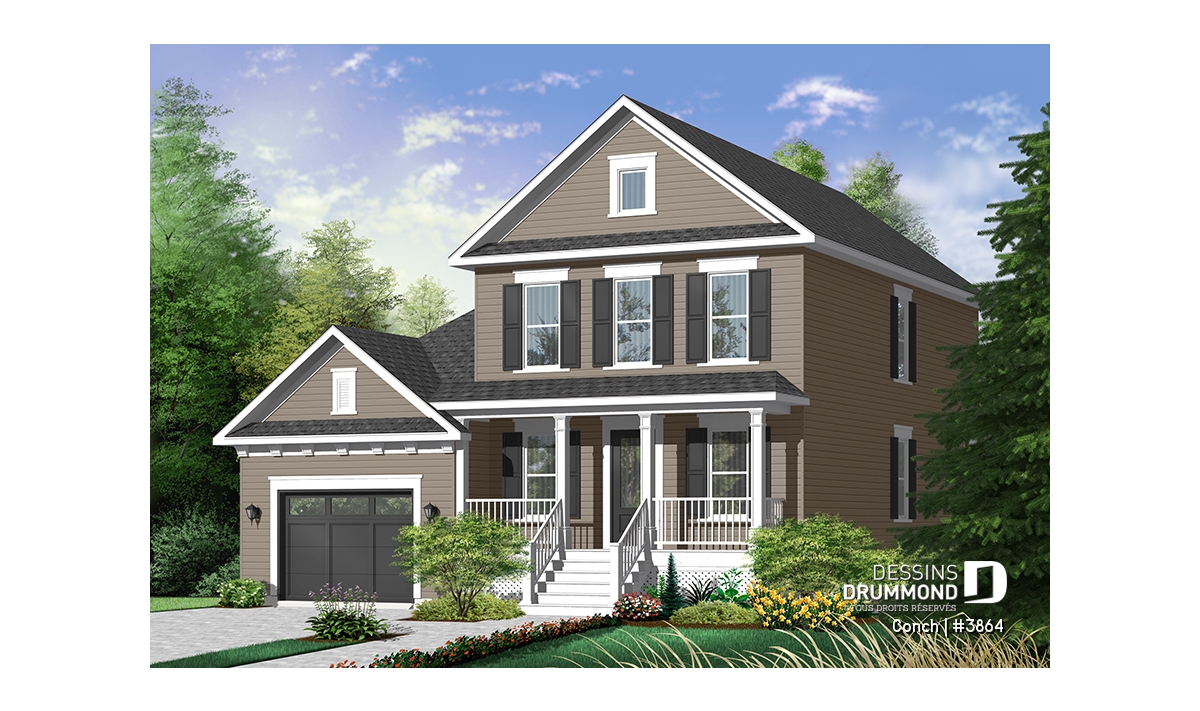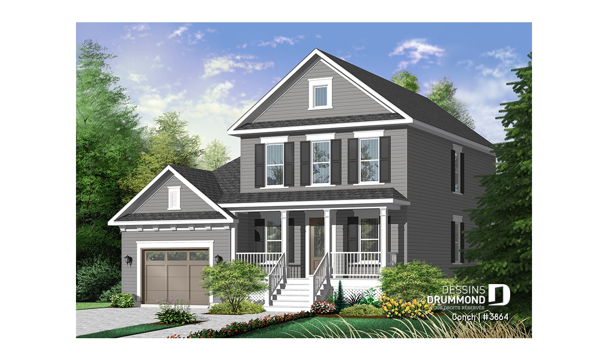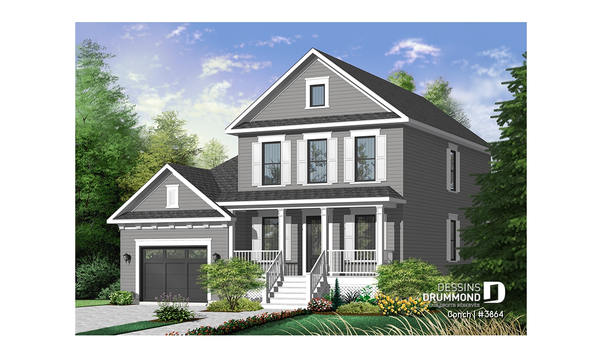 À l’extérieur, une large galerie des plus invitantes se marie à une fenestration bien organisée ainsi qu’à un garage à porte fenêtrée afin de recréer l’effet américain escompté. Le garage suggère d’ailleurs un rangement additionnel à l’arrière et une descente au sous-sol comme tant convoitée par les propriétaires québécois.
