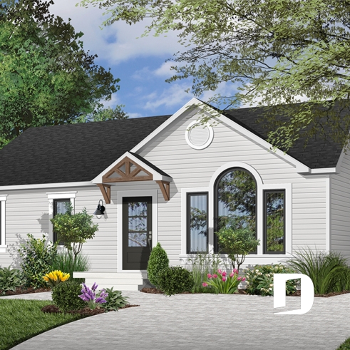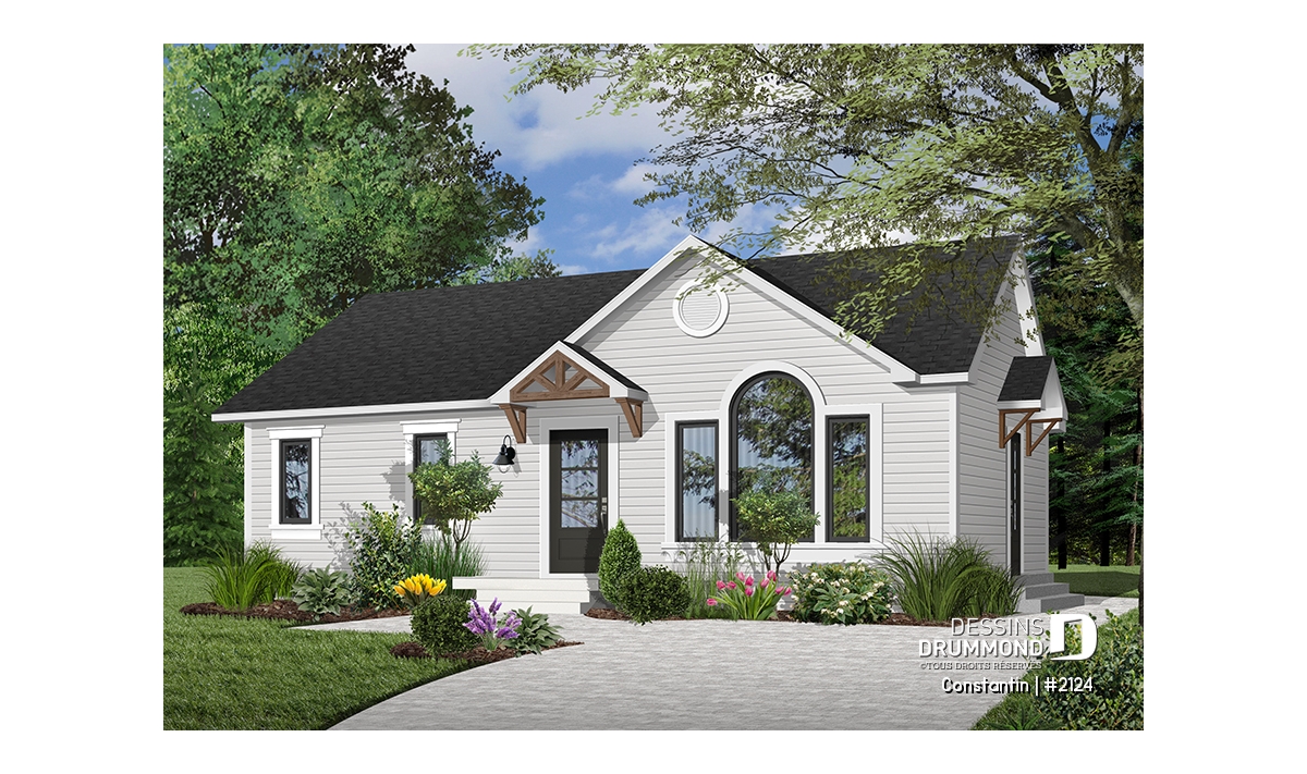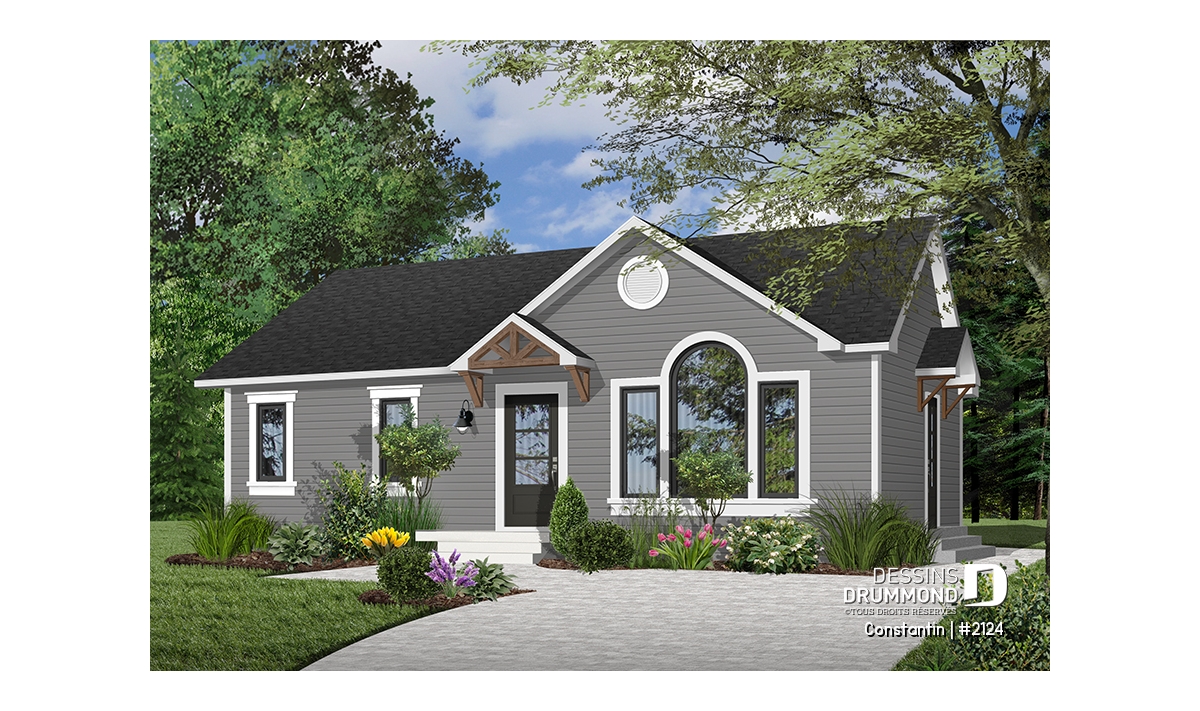 Vue avant - MODÈLE DE BASE - Plan de maison de plain-pied pour petit budget, 2 chambres, entrée accueillante, beau look contemporain - Constantin