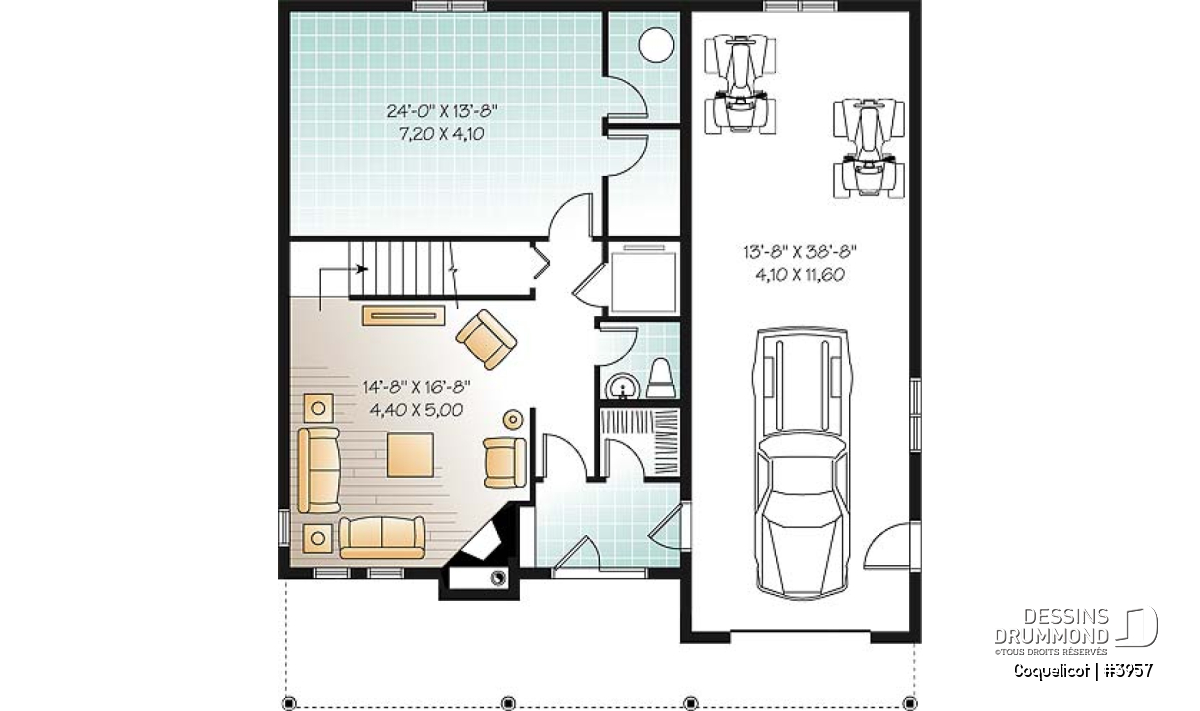 Le rez-de-jardin accueille les occupants avec une entrée principale munie d’un walk-in pratique, parfait pour les équipements sportifs et les vêtements d’extérieur. On y retrouve également une vaste salle de jeux dotée d’un foyer, un atelier-rangement pensé pour les outils et loisirs, un coin toilette, ainsi qu’un garage double de style tandem offrant une profondeur généreuse pour véhicules, VR compacts ou embarcations saisonnières.