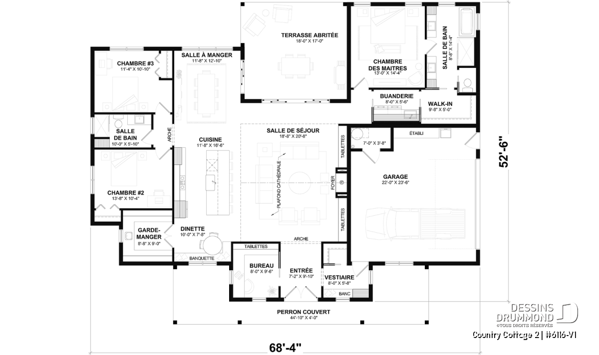 Garage latéral, Accès au garage par le côté, Chambres séparées, Suite des maîtres au rdc, Galerie 2-3 côtés, Ilôt, Garde-manger, Tablettes, Banquette, Arche, Plafond cathédrale, Plafond à plus de 8', Bain et douche séparés, Foyer, Meuble(s) encastré(s), Dinette / Coin déjeuner