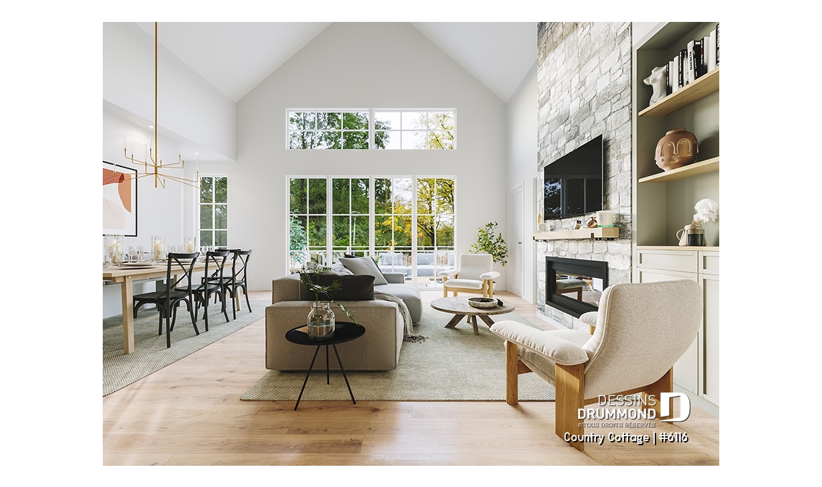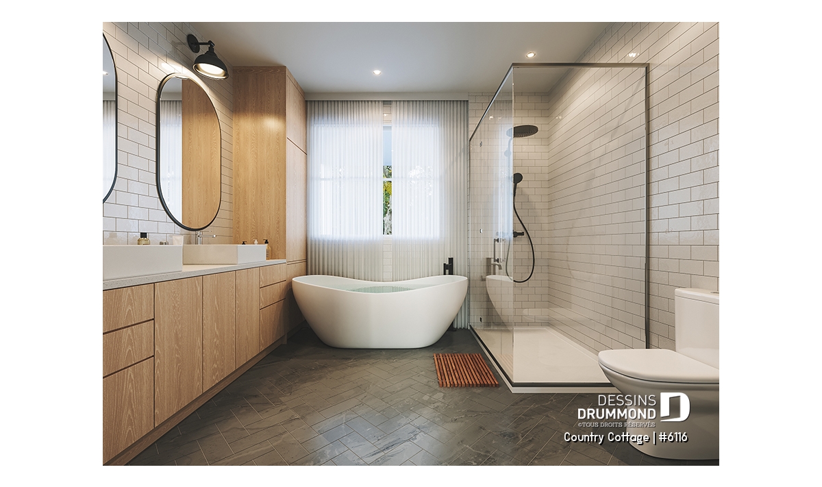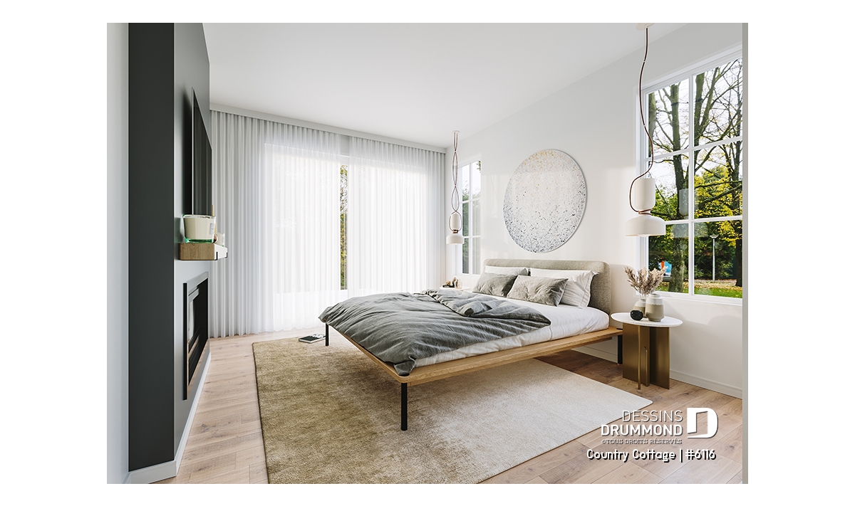 Le foyer double face offre une atmosphère enveloppante autant dans le salon que dans la suite des parents, un détail hautement recherché dans les maisons champêtres modernes. La suite principale bénéficie d’un accès direct à l’abri moustiquaire arrière — un véritable havre de paix — en plus d’une salle de bain privée avec bain et douche séparés ainsi que deux lavabos.