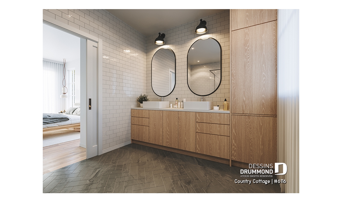 Suite des parents avec accès direct à l’abri moustiquaire arrière, salle de bain privée avec bain et douche séparés, ainsi que deux lavabos.