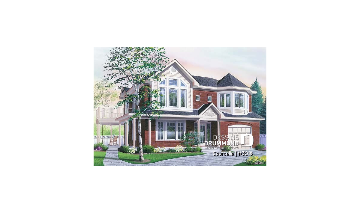 Vue avant - MODÈLE DE BASE - Plan de maison bi-génération avec garage, unité famille à l'étage avec 3 chambres, superbe galerie - Courcelle