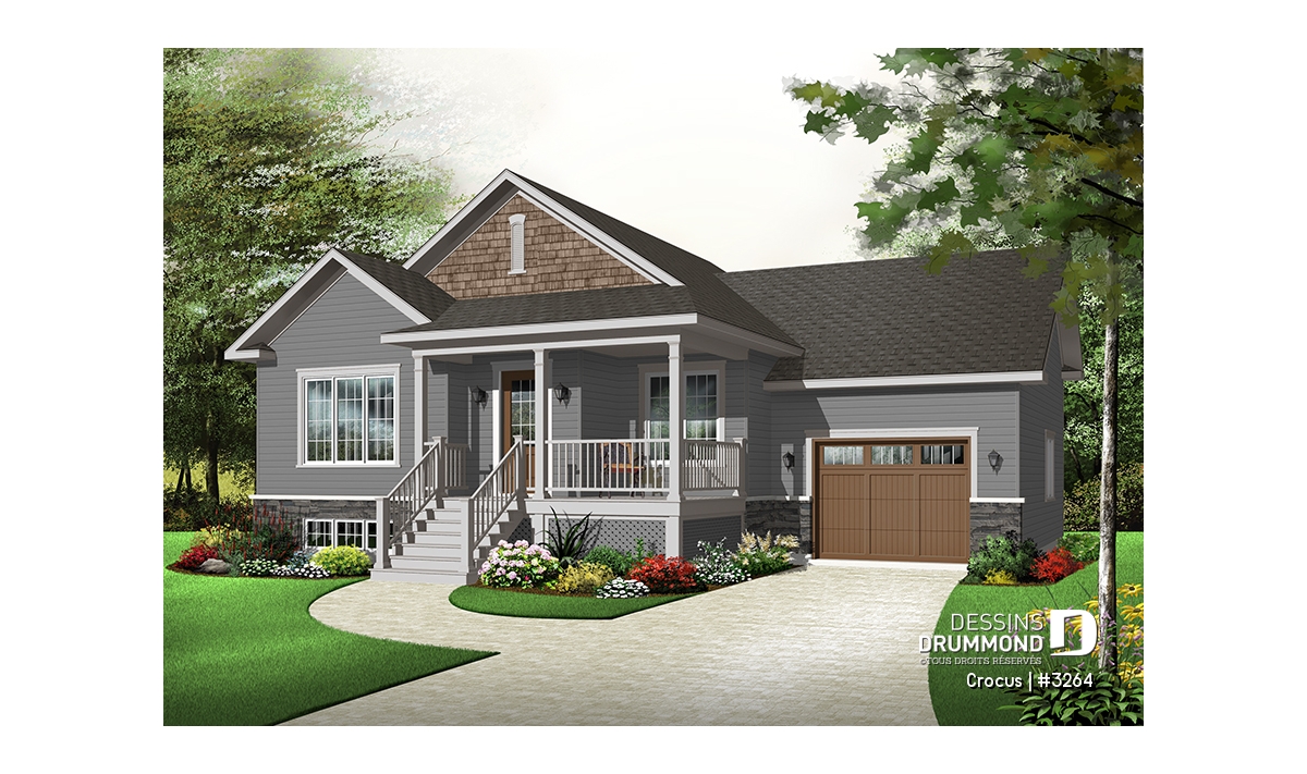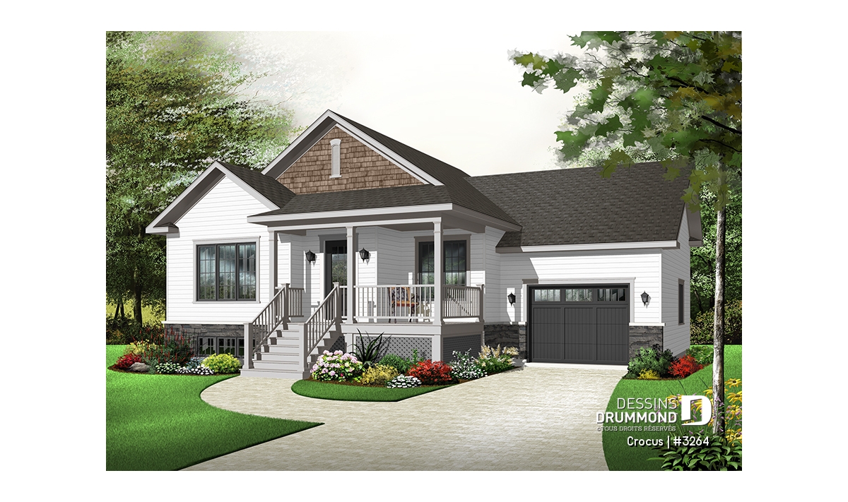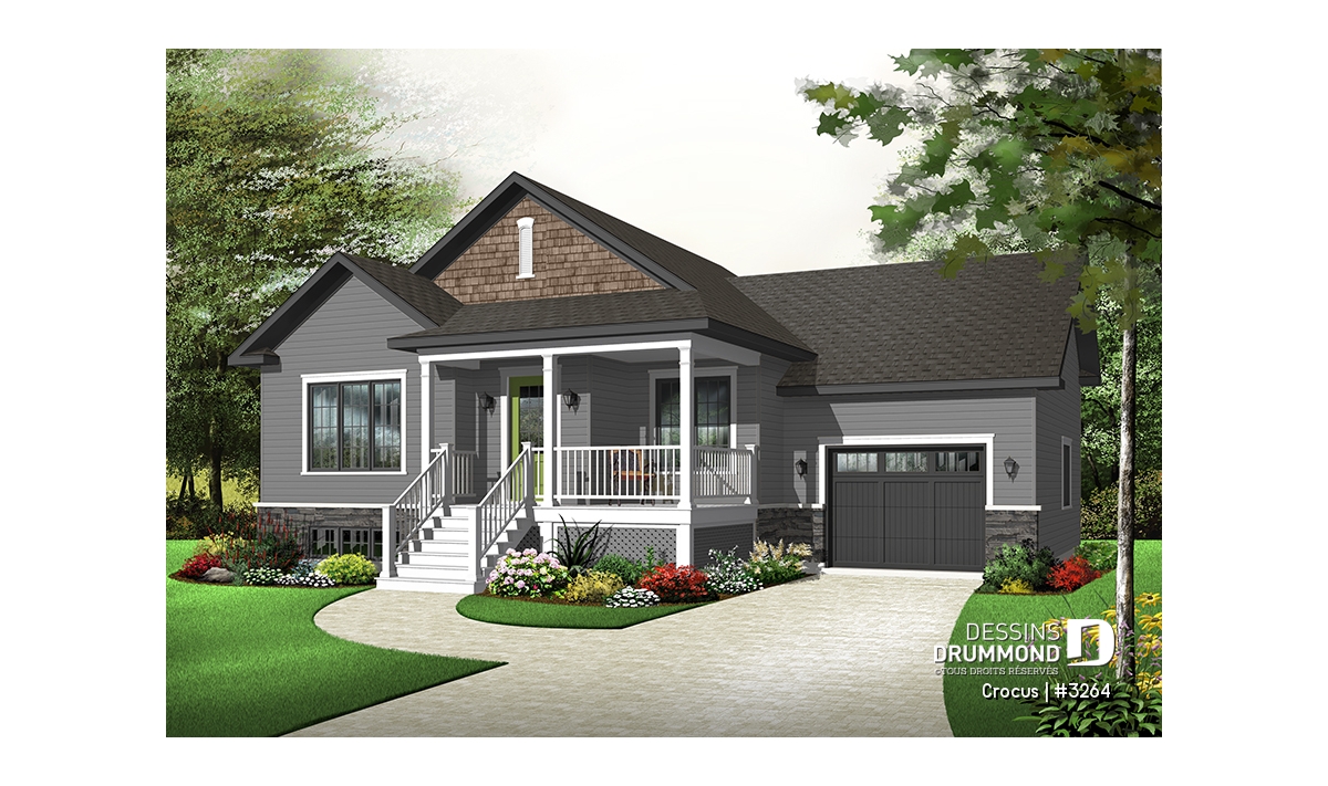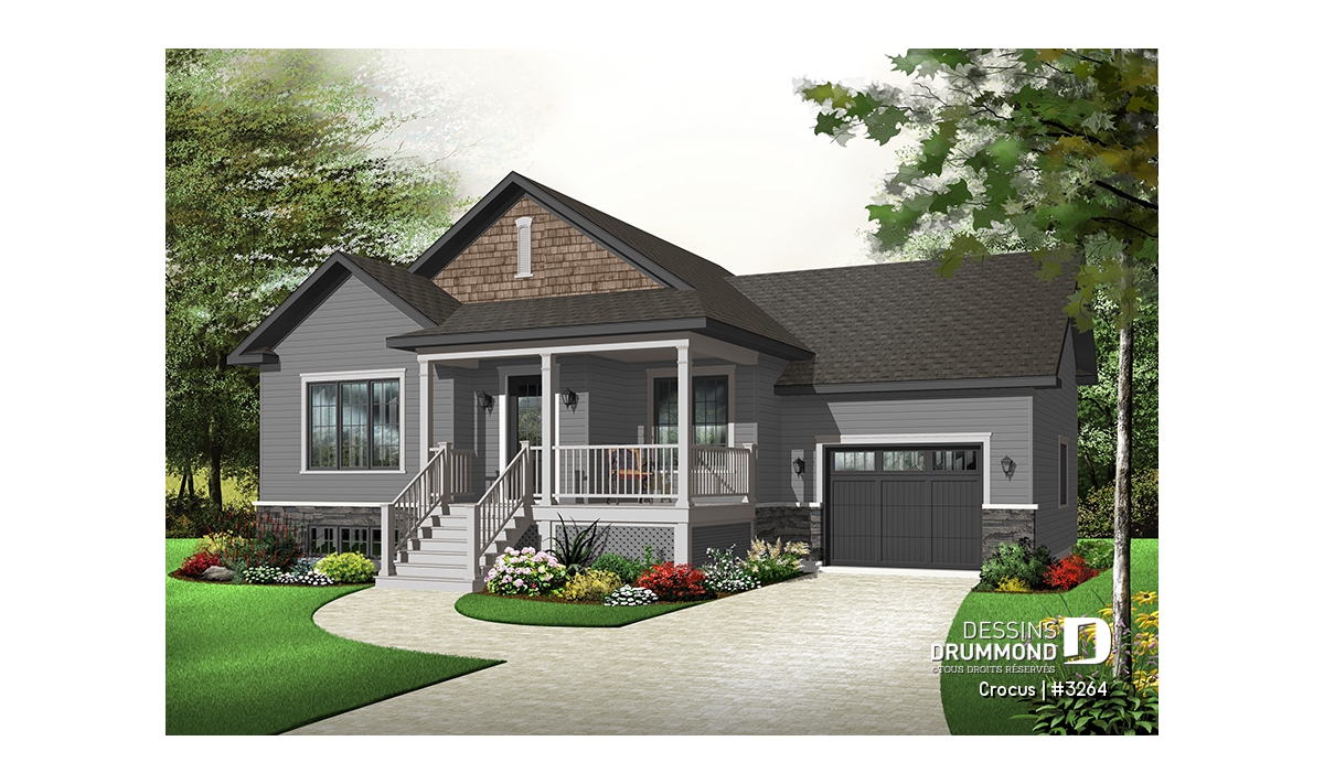 Plan de maison Craftsman, grande galerie, vestibule, 2 chambres, garage accès au s-s