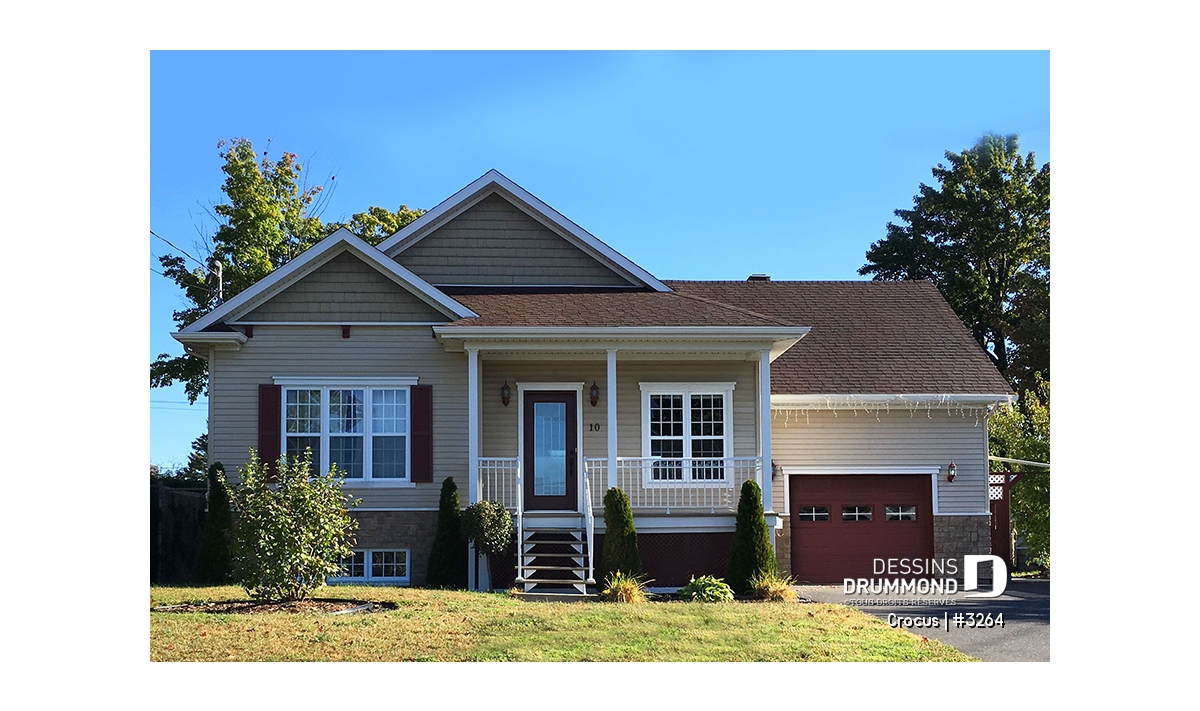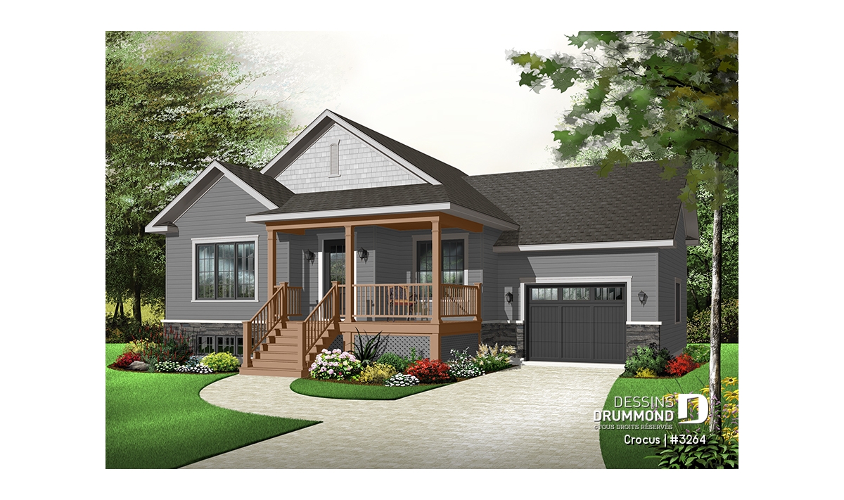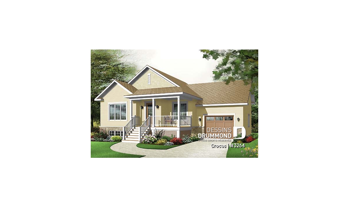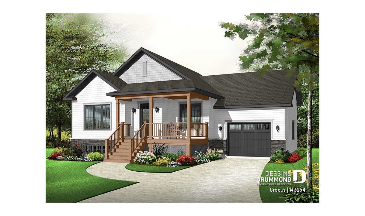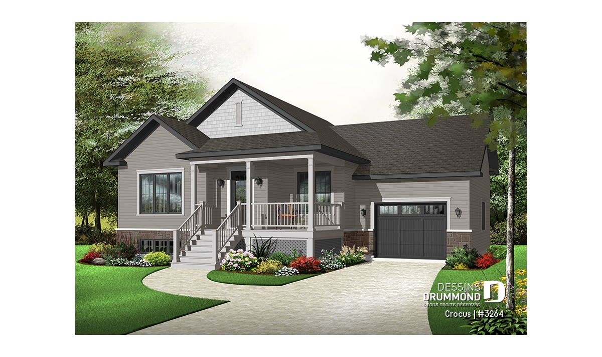 Plan de maison Craftsman, grande galerie, vestibule, 2 chambres, garage accès au s-s