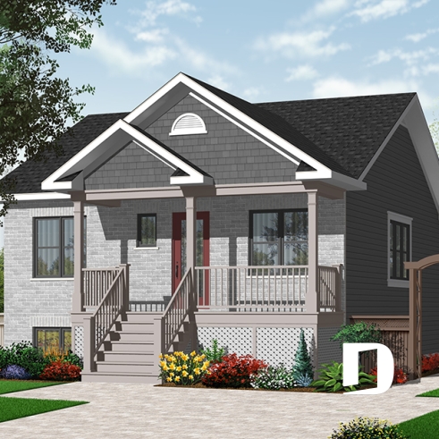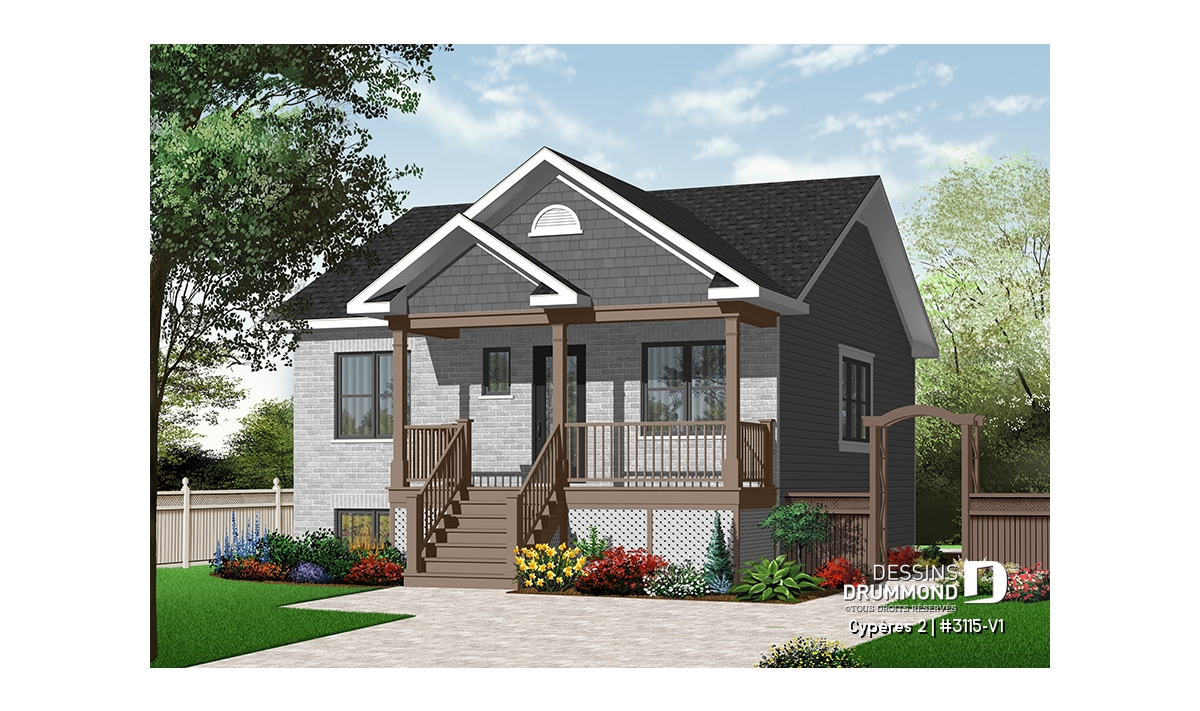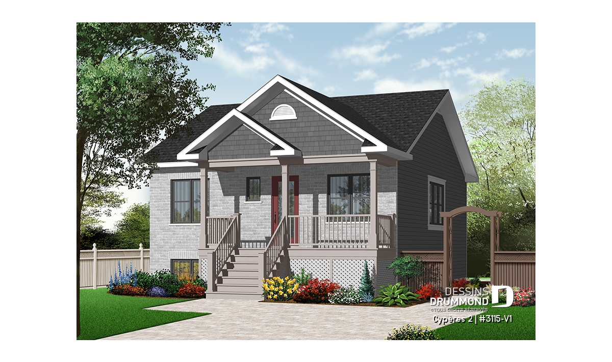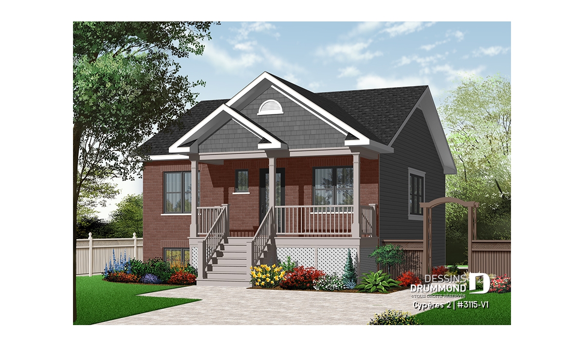 Vue avant - MODÈLE DE BASE - Plan de bungalow ou plain-pied avec façade en brique, 2 chambres, aire ouverte, sous-sol sorti de terre - Cypères 2