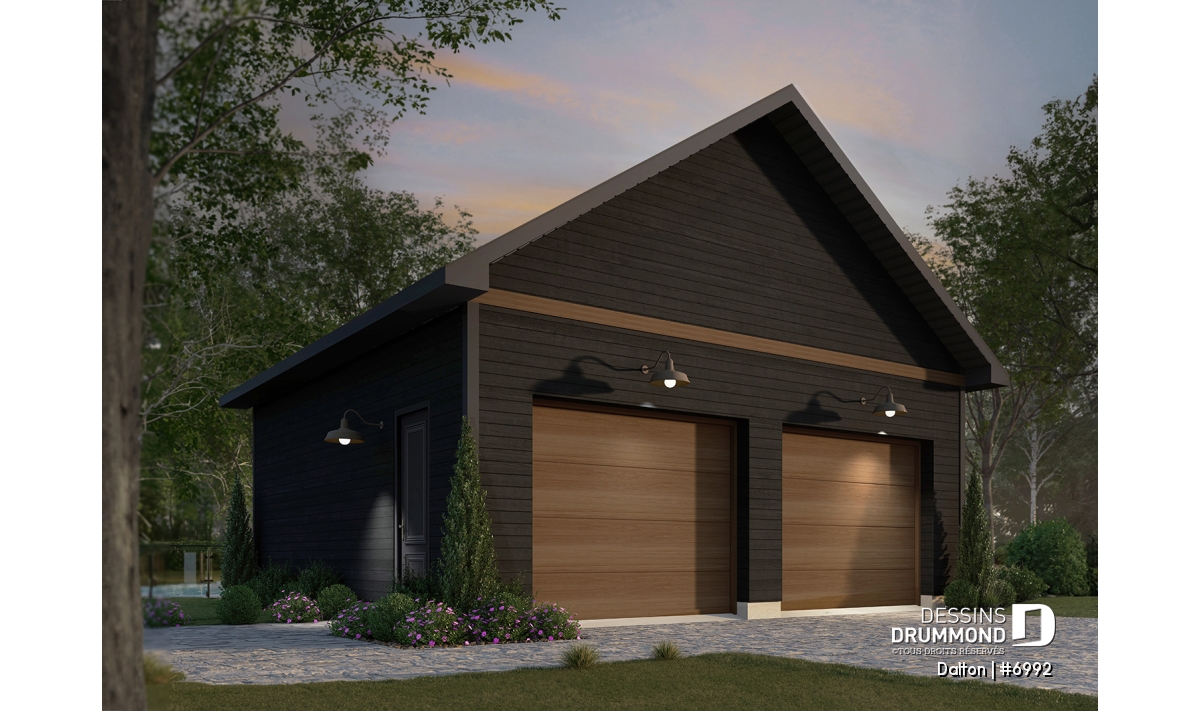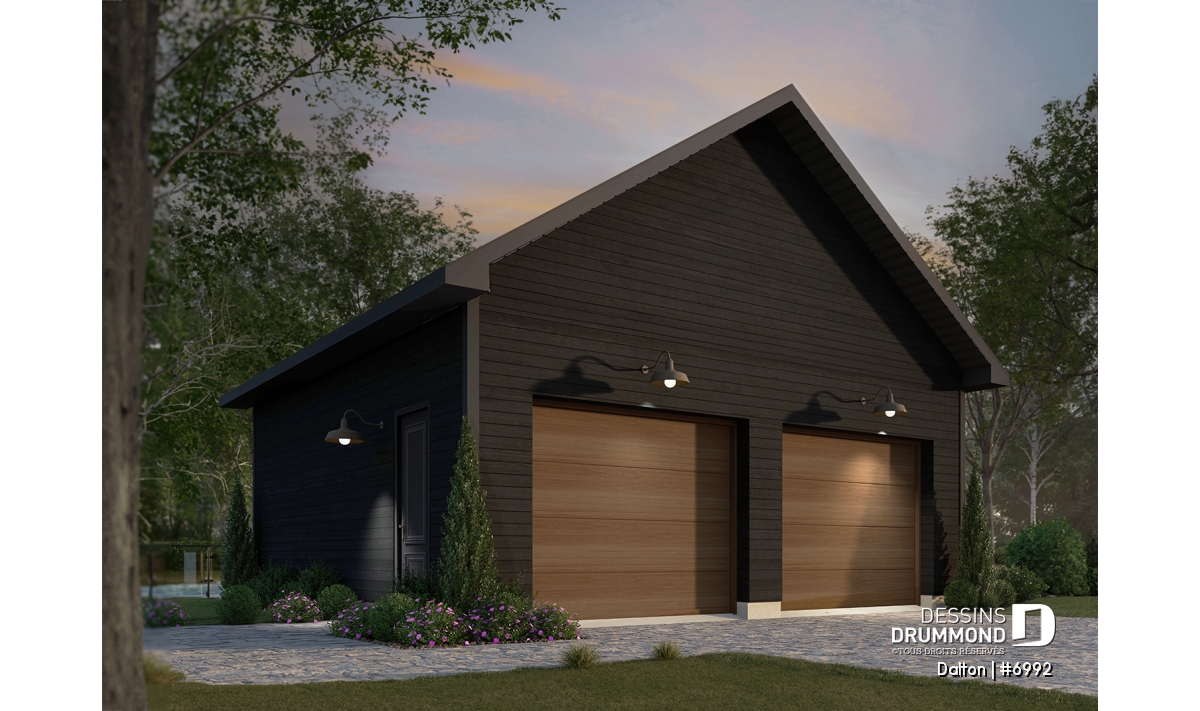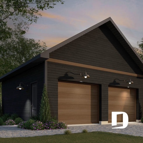 Le plan de garage DALTON (#6992) propose un extérieur des plus attrayants avec son look épuré qui conviendra à plusieurs styles de maison. Il prévoit un espace adéquant de 24' x 24' pour y loger confortablement 2 voitures. La hauteur du plafond prévu est de 9', les murs sont isolés pour plus de confort et la fondation de base est une dalle flottante.