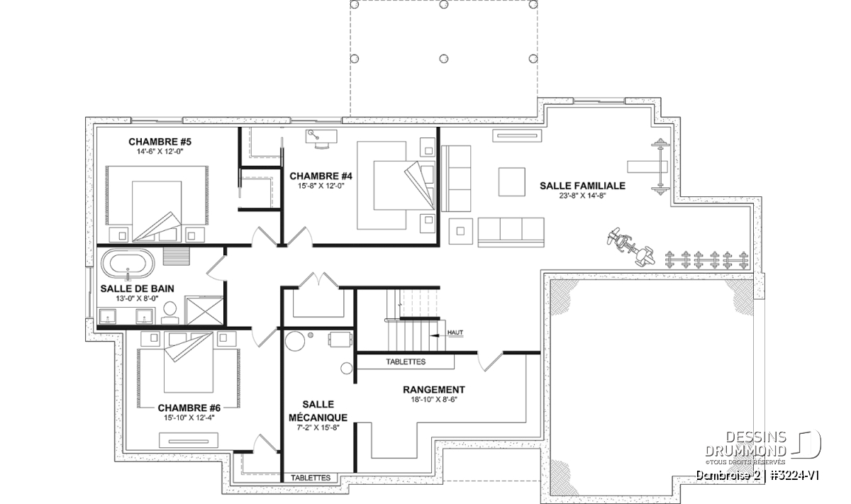 *Si vous souhaitez acheter le plan du sous-sol aménagé, tel que présenté sur la page de ce plan, veuillez sélectionner cette option dans le panier d'achat, dans la section "Sélectionner votre fondation". Si vous ne sélectionnez pas cette option, vous recevrez le sous-sol non fini, sans frais additionnel.