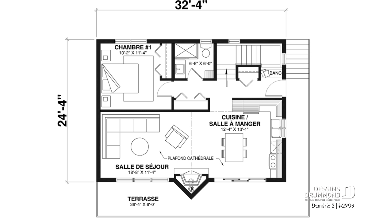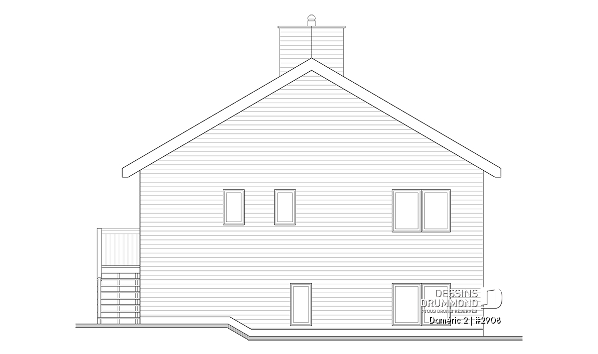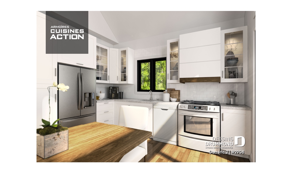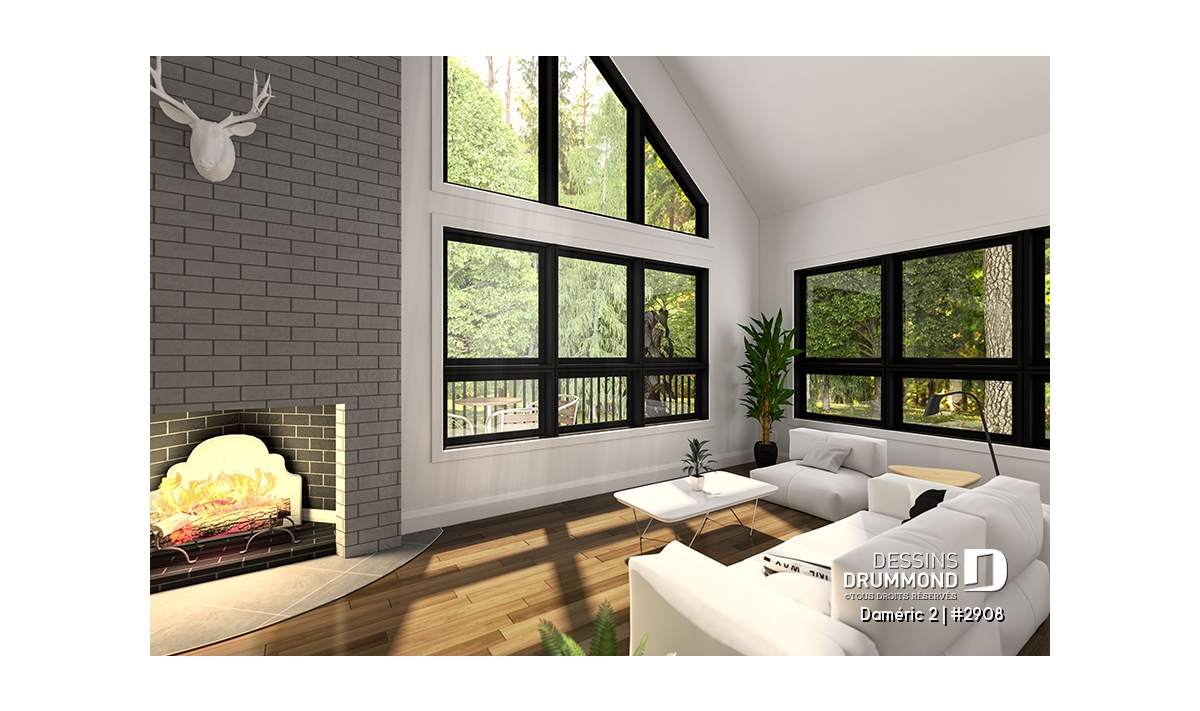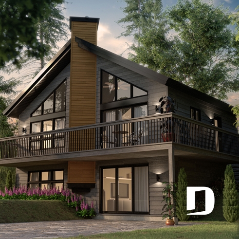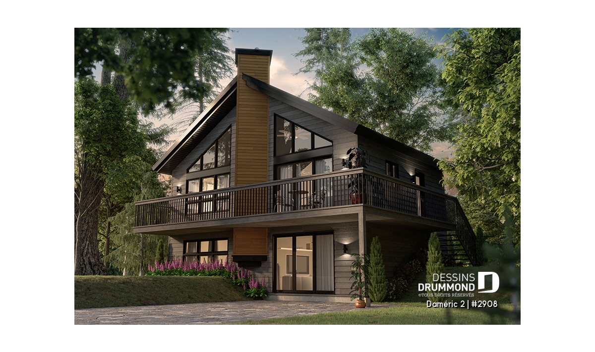 Le plan de maison DAMÉRIC (#2908) nous propose une maison de style chalet champêtre avec immense fenestration et 1 574 pieds carrés.