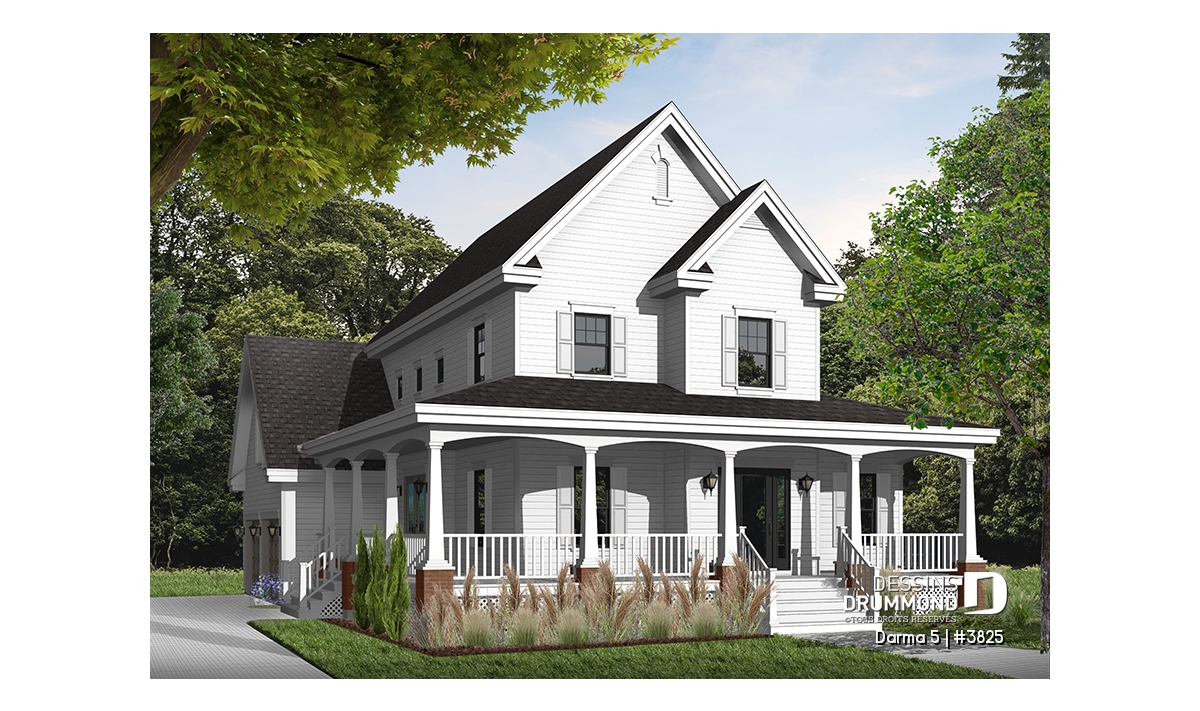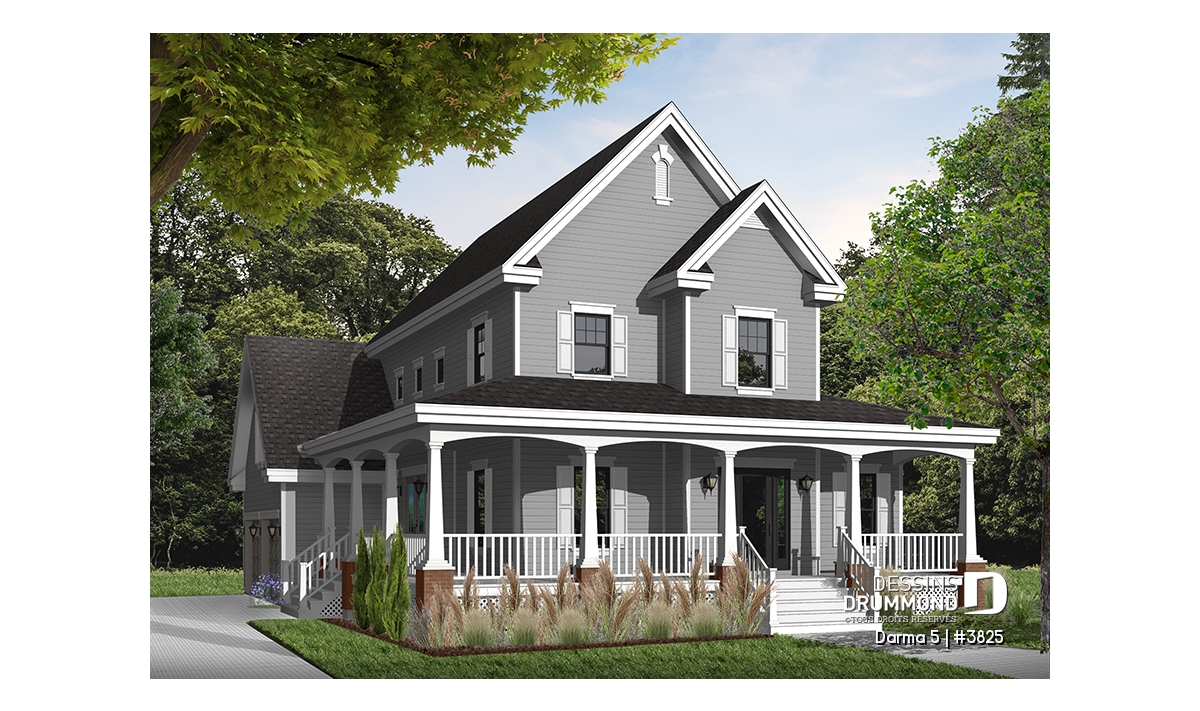 Version couleur no. 2 - Vue avant - Plan de maison 3 chambres, grande galerie couverte à l'avant, garage double, mezzanine, plafond 9' - Darma 5