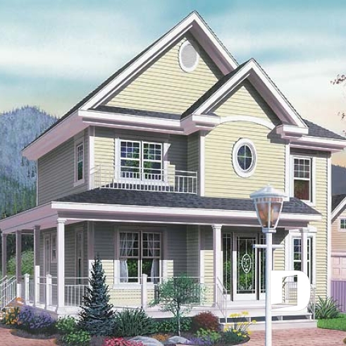 Vue avant - MODÈLE DE BASE - Plan de maison traditionnelle, à étage, grand balcon couvert avant/côté, 3 chambres, bureau à domicile - Darma