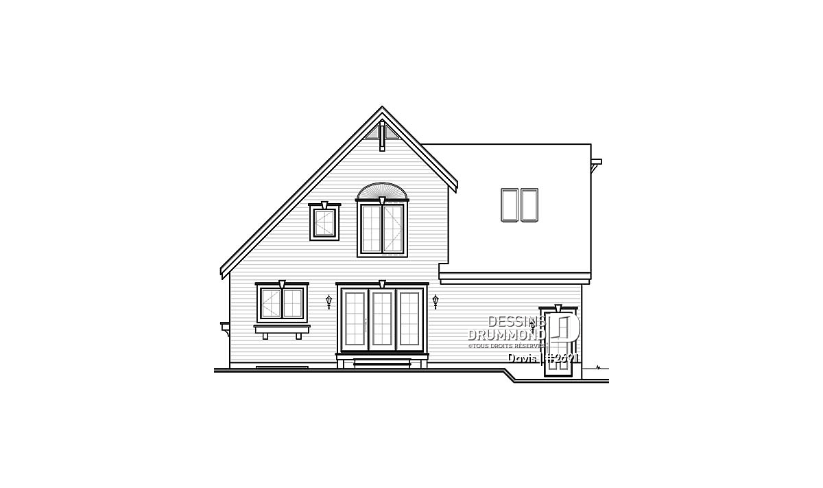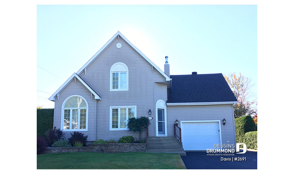 D’abord empreinte de lignes simples quant à l’extérieur, cette maison n’en est pas moins élégante avec son pignon central au faîte suffisamment élevé auquel s’alignent parfaitement deux fenêtres, dont une avec moulure chic et plus qu’appropriée à la tête. La porte principale, aménagée à angle, confère à cette façade une identité qui lui est propre tout en demeurant des plus invitantes.
