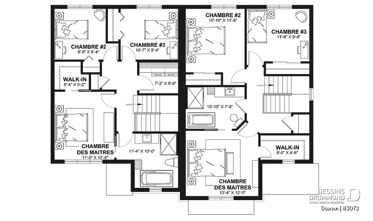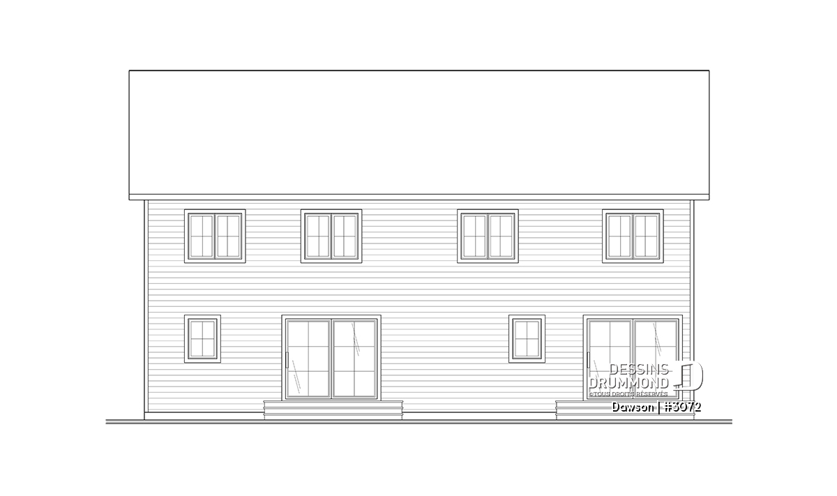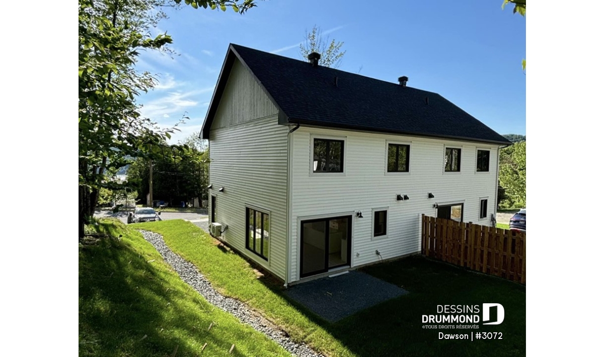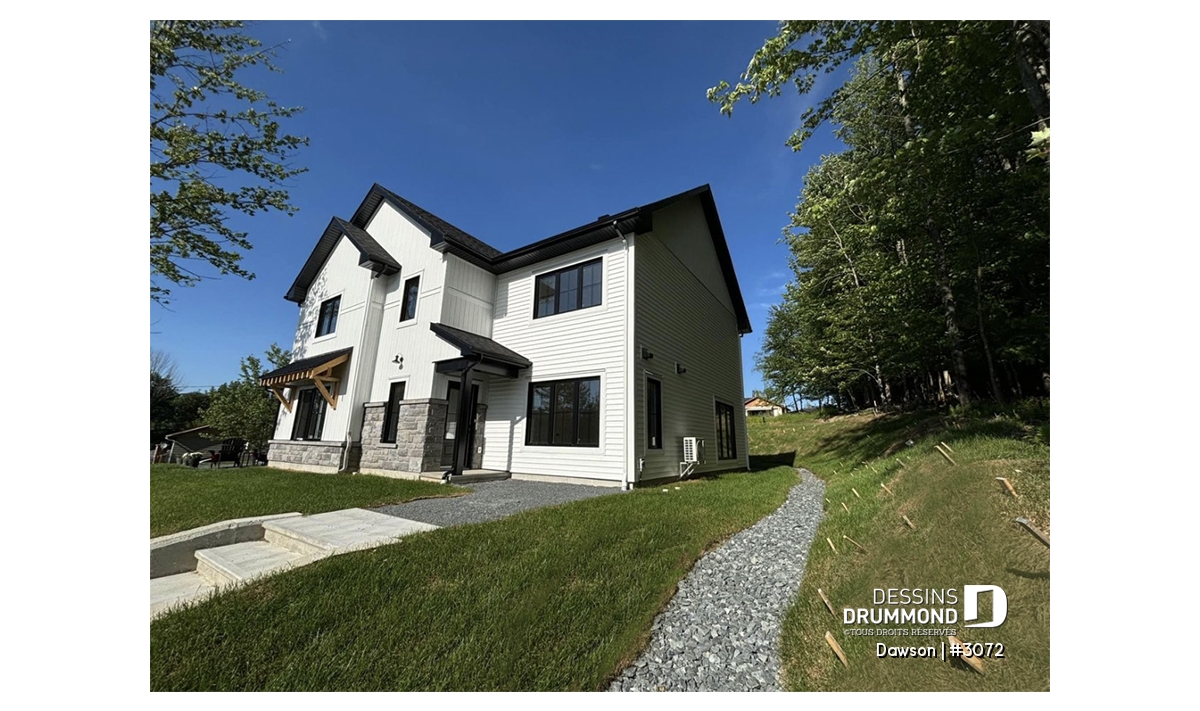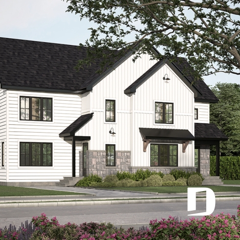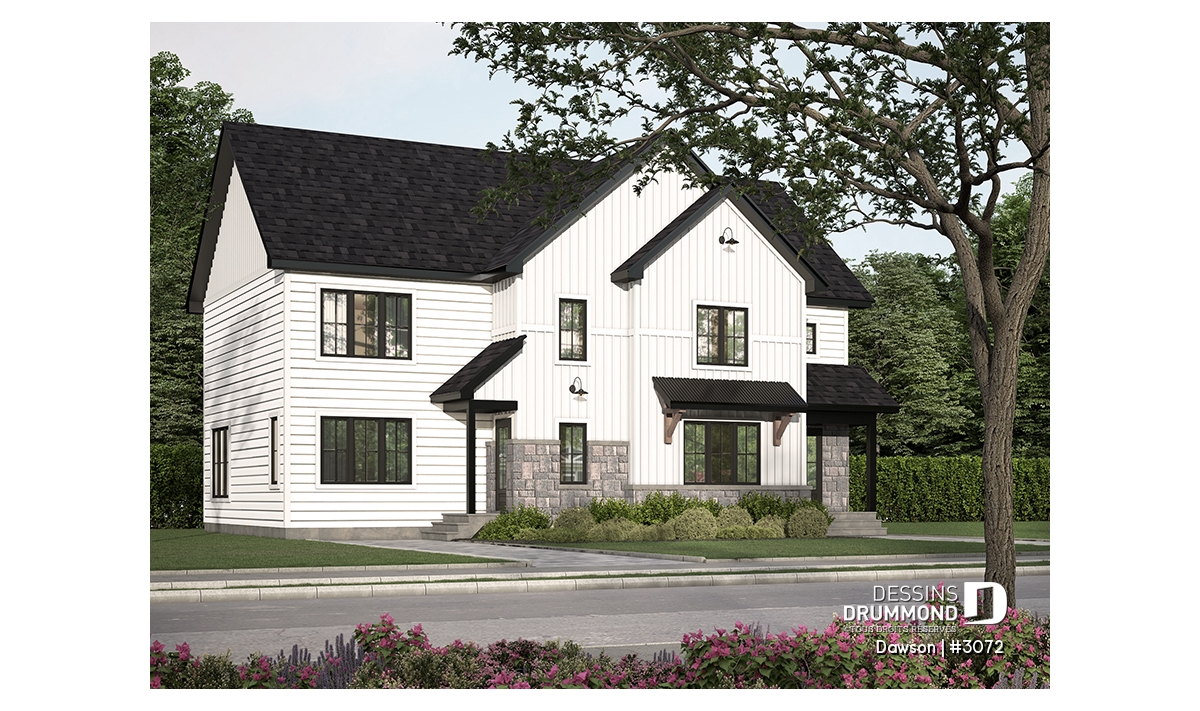 Plan de maison jumelée à étage, de style farmhouse champêtre.