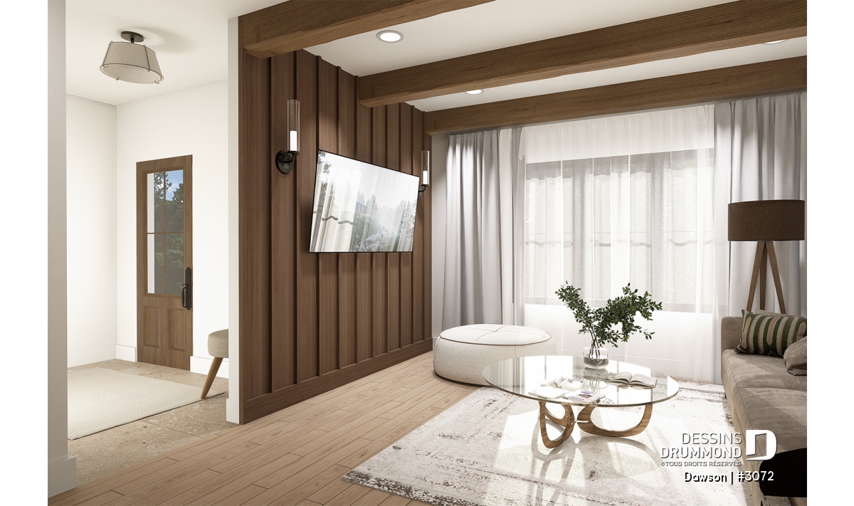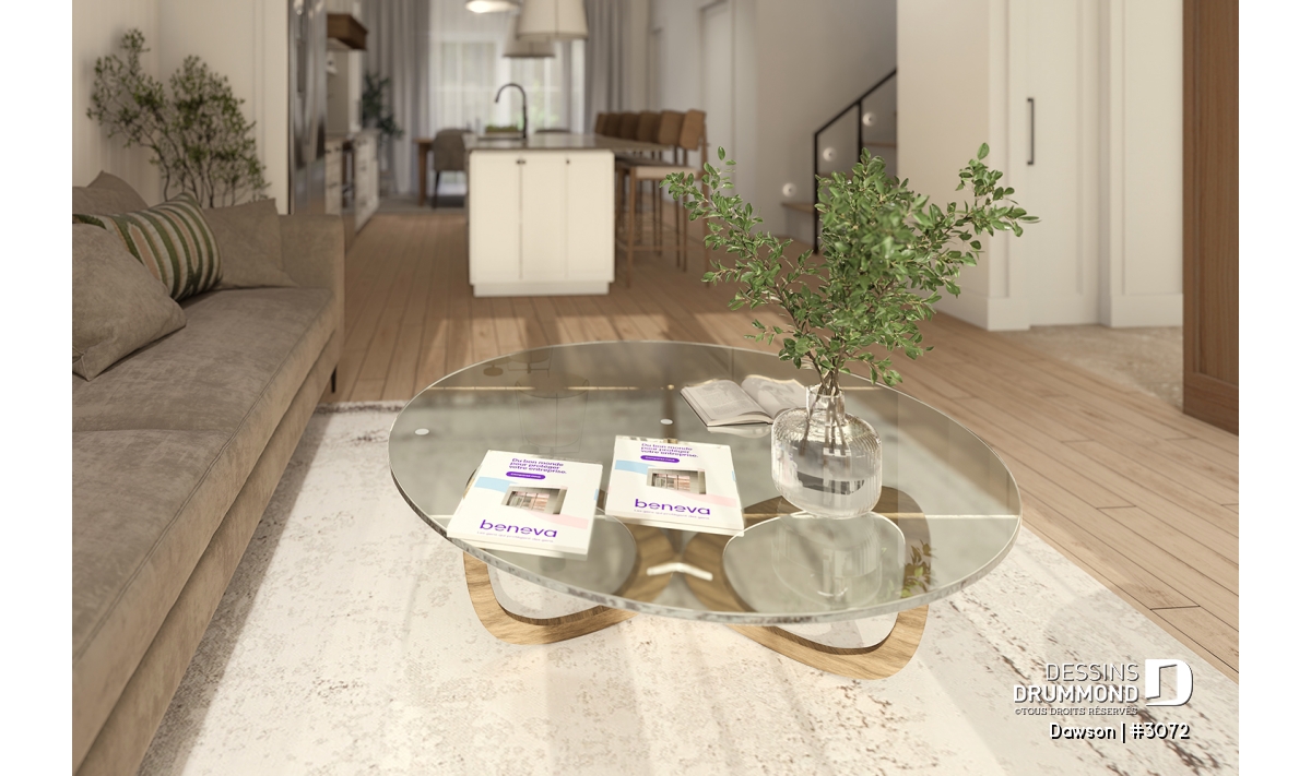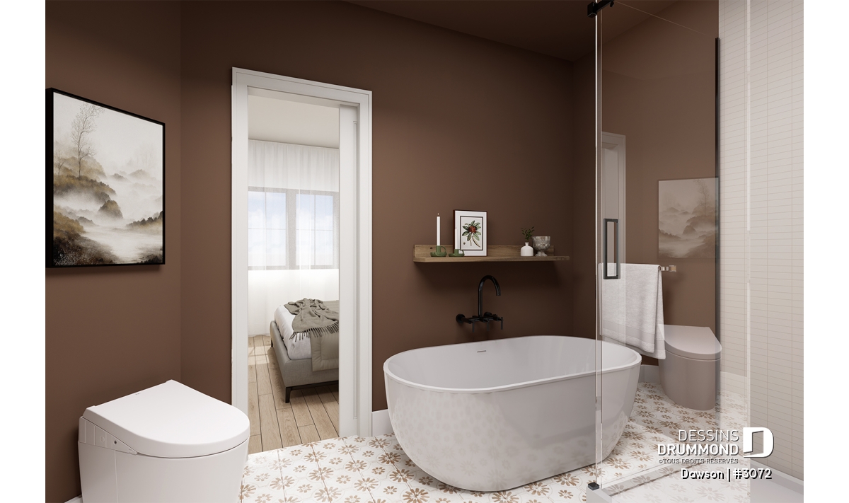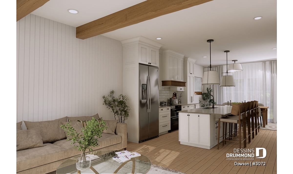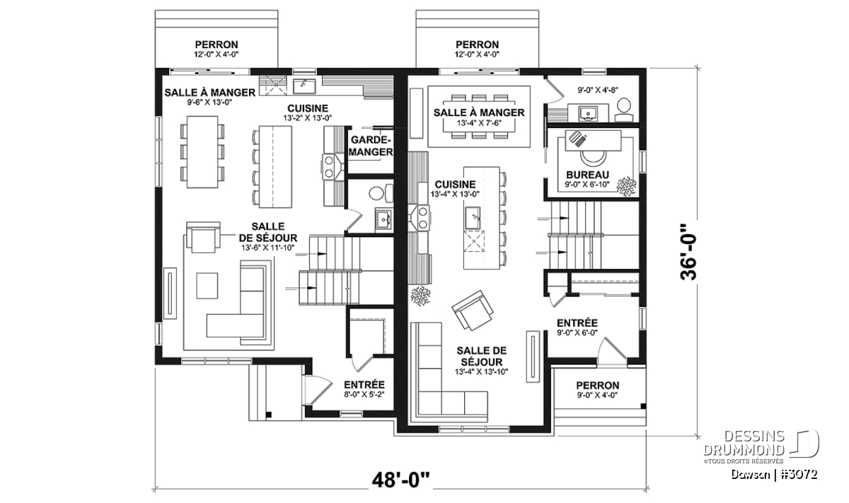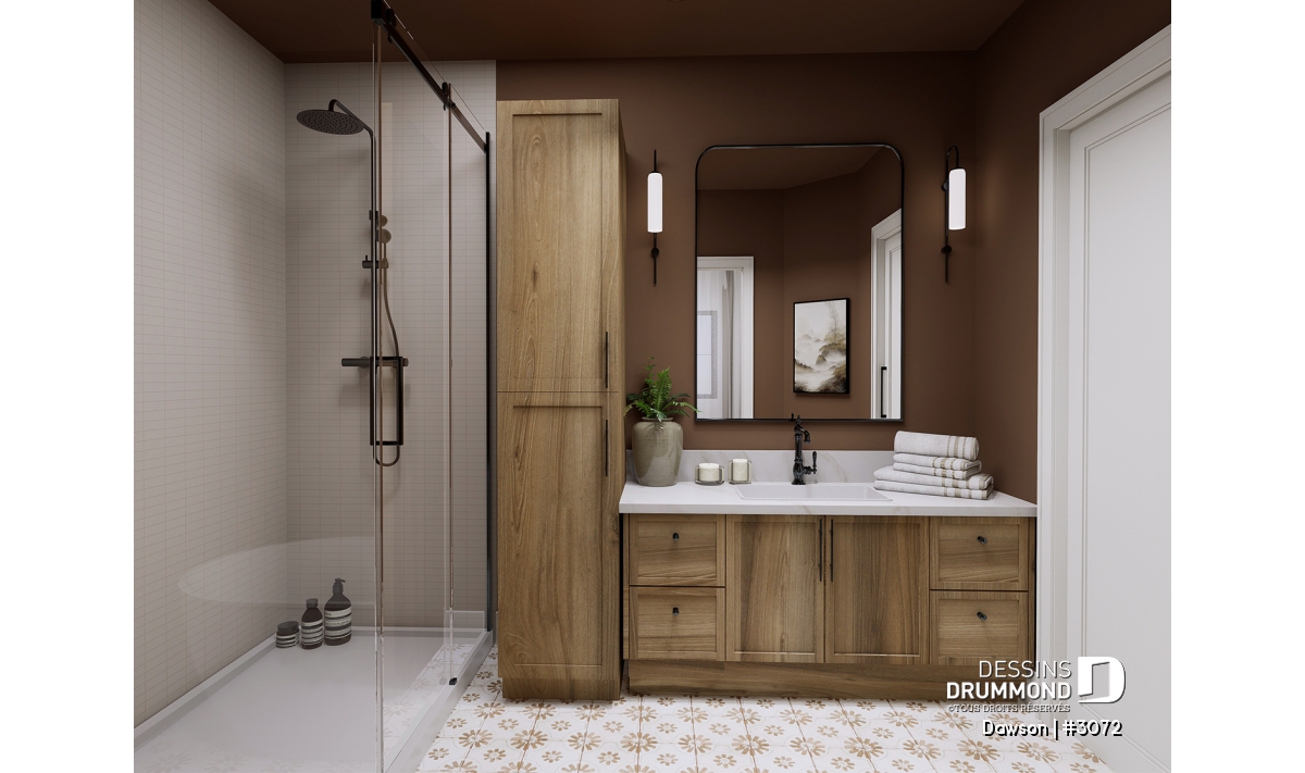 Plan de maison jumelée à étage, de style farmhouse champêtre.