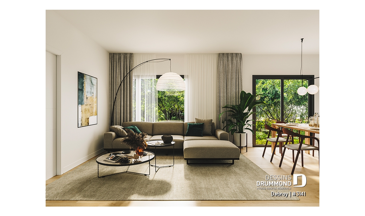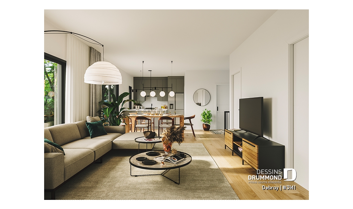 Dans la cuisine on retrouve un îlot pratique et fonctionnel, avec évier et lave-vaisselle intégrés, libérant ainsi de l'espace de rangement. Un point intéressant est sans aucun doute le garde-manger de plus de 7pi de largeur, avec une fenêtre rectangulaire dans le haut du mur du fond, ramenant le style moderne de la maison. De plus, cette fenêtre donne une belle luminosité quand la porte coulissante reste ouverte. Cette luminosité se retrouve également dans l’espace de la salle à manger, grâce à la porte patio menant sur la terrasse extérieure, ainsi que dans la salle de séjour avec de belles grandes fenêtres.