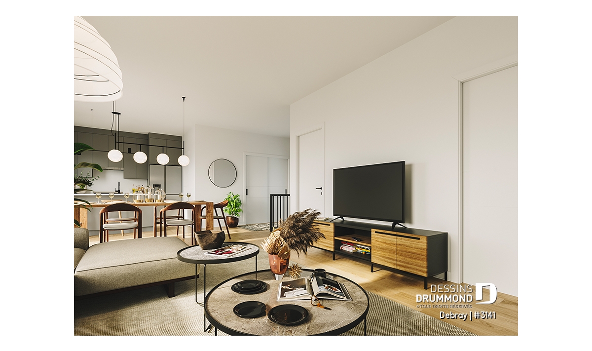 Une fois à l’intérieur, un vestibule avec une garde-robe double permet un rangement de tous les objets du quotidien. Ce vestibule débouche sur l’espace de vie commune à aire ouverte.
