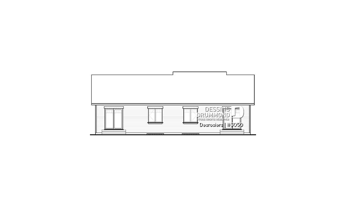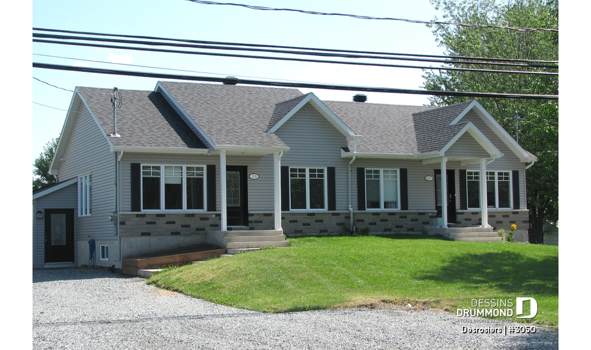 Secteur activités entièrement ouvert. Salle de bain avec espace buanderie, bain et douche en coin. Porte-patios arrières aux extrémités pour plus d'intimité. Façade principale avec variantes extérieures.