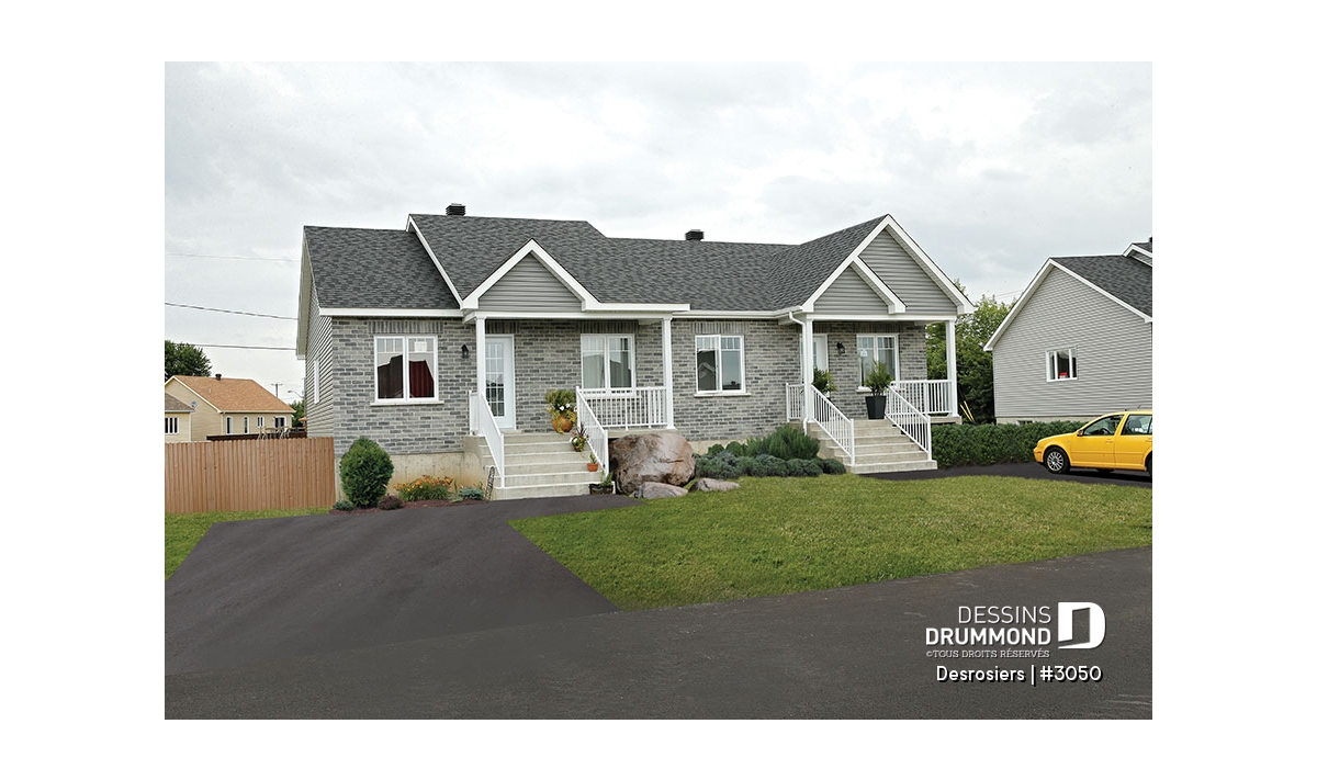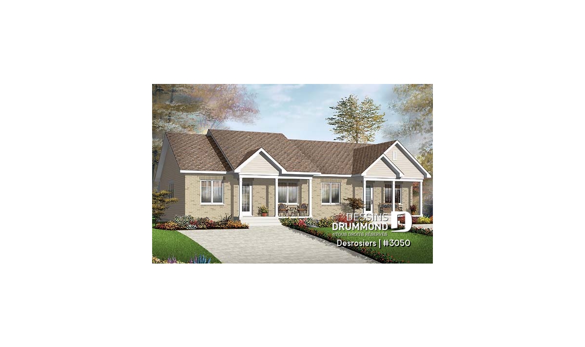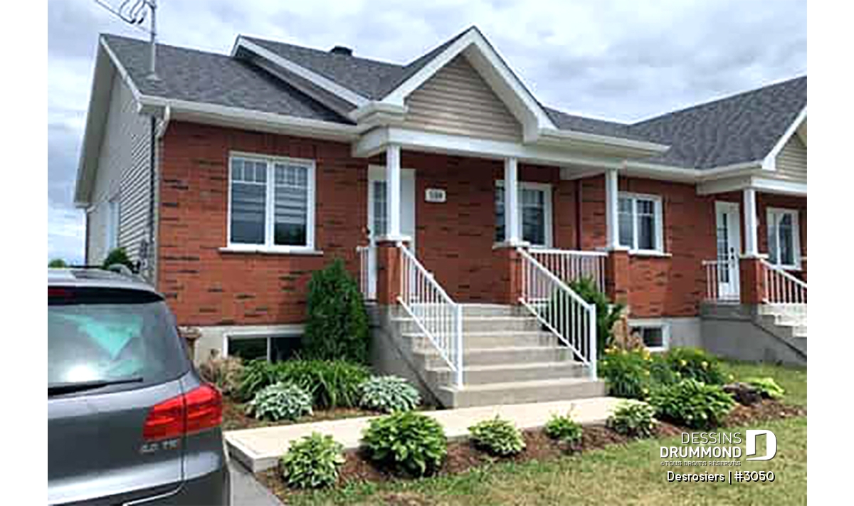 Vue avant - MODÈLE DE BASE - Plan de maison jumelé, 2 chambres, belle galerie avant, buanderie au rez-de-chaussée, comptoir-lunch - Desrosiers
