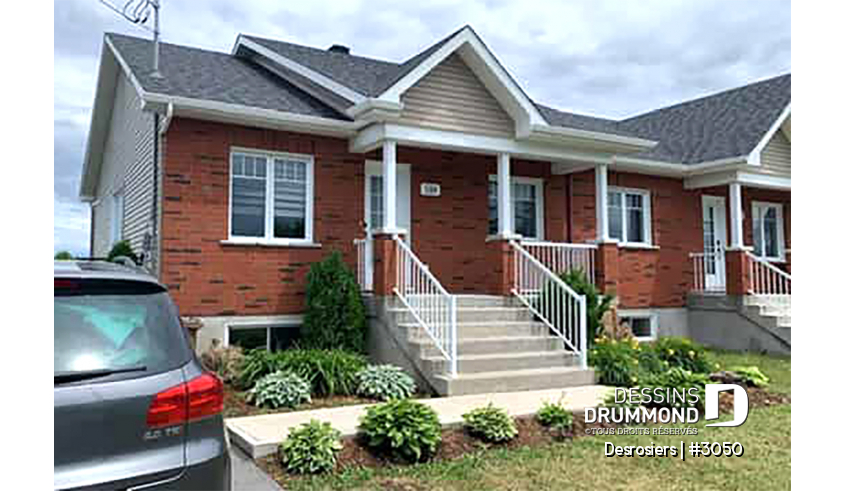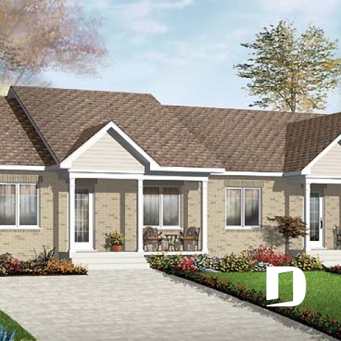 Plan de maison jumelé, 2 chambres, belle galerie avant, buanderie au rez-de-chaussée, comptoir-lunch