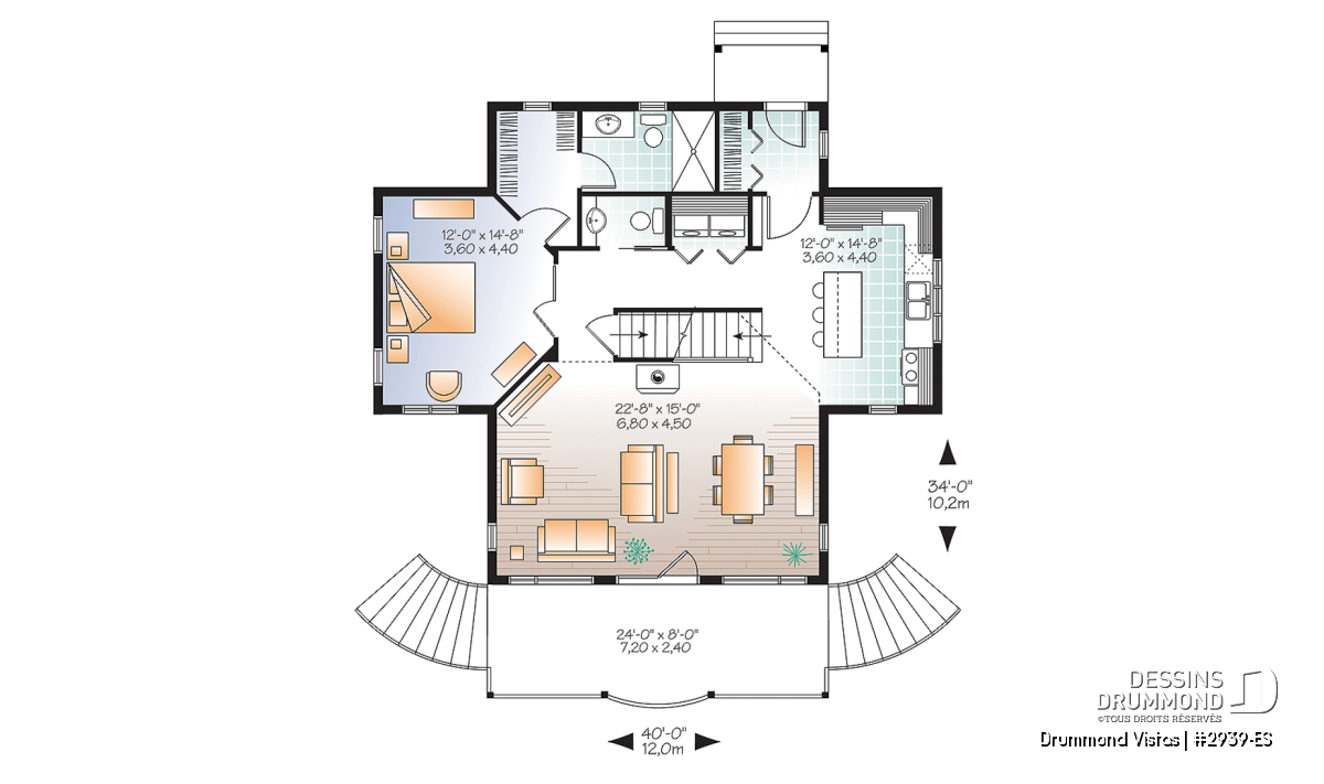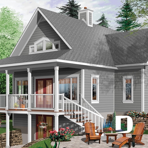 Dans le but de vous permettre de bien vieillir avec votre chalet, ce plan 2939-ES (Drummond Vistas) est conçu afin que vous viviez au quotidien sur un même plancher. Ainsi, au rez-de-chaussée, appréciez un vestibule à l’entrée avant, une cuisine avec îlot, une salle à manger jumelée à une salle de séjour avec plafond cathédrale et espace pour un poêle ou foyer. Sans oublier une suite des maîtres avec salle de douche privée et un coin laveuse-sécheuse tout près. Une petite salle d'eau complète, pratique pour les invités, complète à merveille ce plancher.