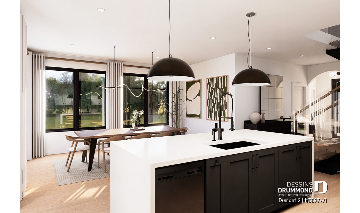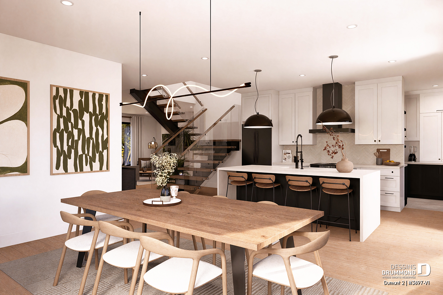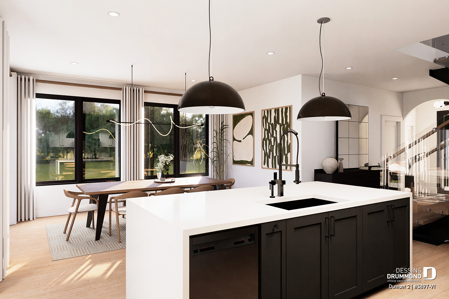 Dans cette maison, tout a été conçu pour rendre la vie quotidienne plus simple et plus agréable. La facilité d'accès du garage au vestiaire et au garde-manger est vraiment pratique, surtout après une session d'achats. Et au cœur de la maison, la cuisine est véritablement le lieu où l'on peut partager des moments de convivialité en famille ou entre amis, avec son îlot central très utile et son grand garde-manger qui permet de ranger toutes les provisions. La cuisine est vraiment spacieuse et conviviale, c'est l'endroit parfait pour préparer des repas en famille ou recevoir des amis. C'est une pièce tout à fait spéciale, qui s'ouvre sur la salle à manger. C'est ici que tout le monde se retrouve. Que ce soit pour préparer un repas en famille, pour discuter de tous les projets qu'il faudra réaliser au cours de la journée, ou simplement pour partager des moments simples, tous ces instants font partie du bonheur ordinaire d'une famille.