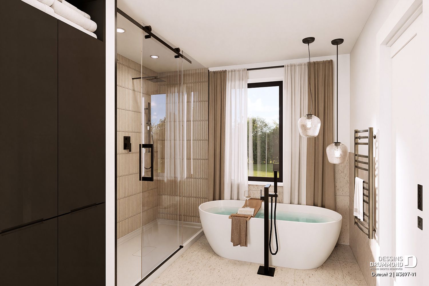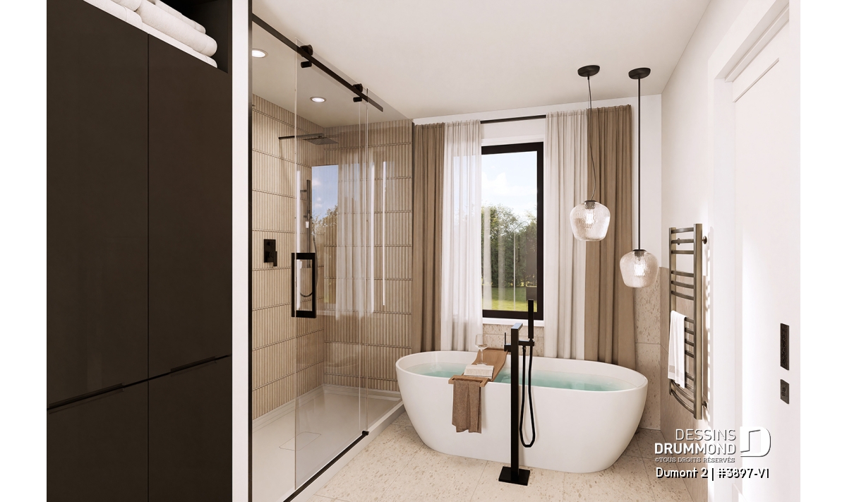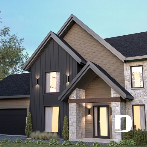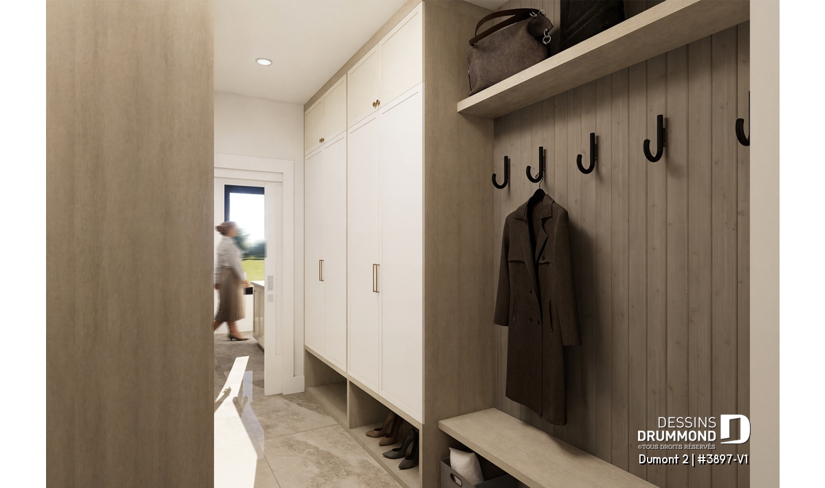 Plafond à plus de 8', Foyer, Vestiaire, Garde-manger, Bureau / Salle étude, Ilôt, Terrasse abritée, Walk-in double ch. maîtres, Bain et douche séparés, Lavabo double, Plafond cathédrale, Salle de lavage à l'étage, Meuble(s) encastré(s), Banquette
