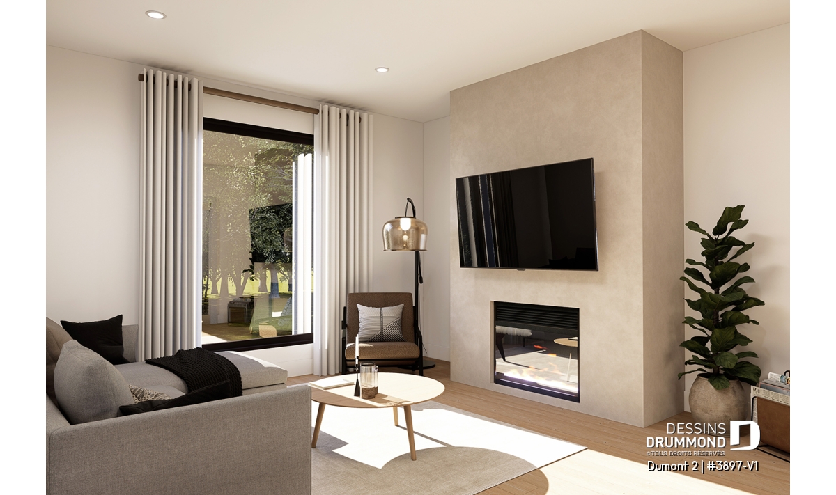 Salle de séjour chaleureuse avec foyer au gaz.