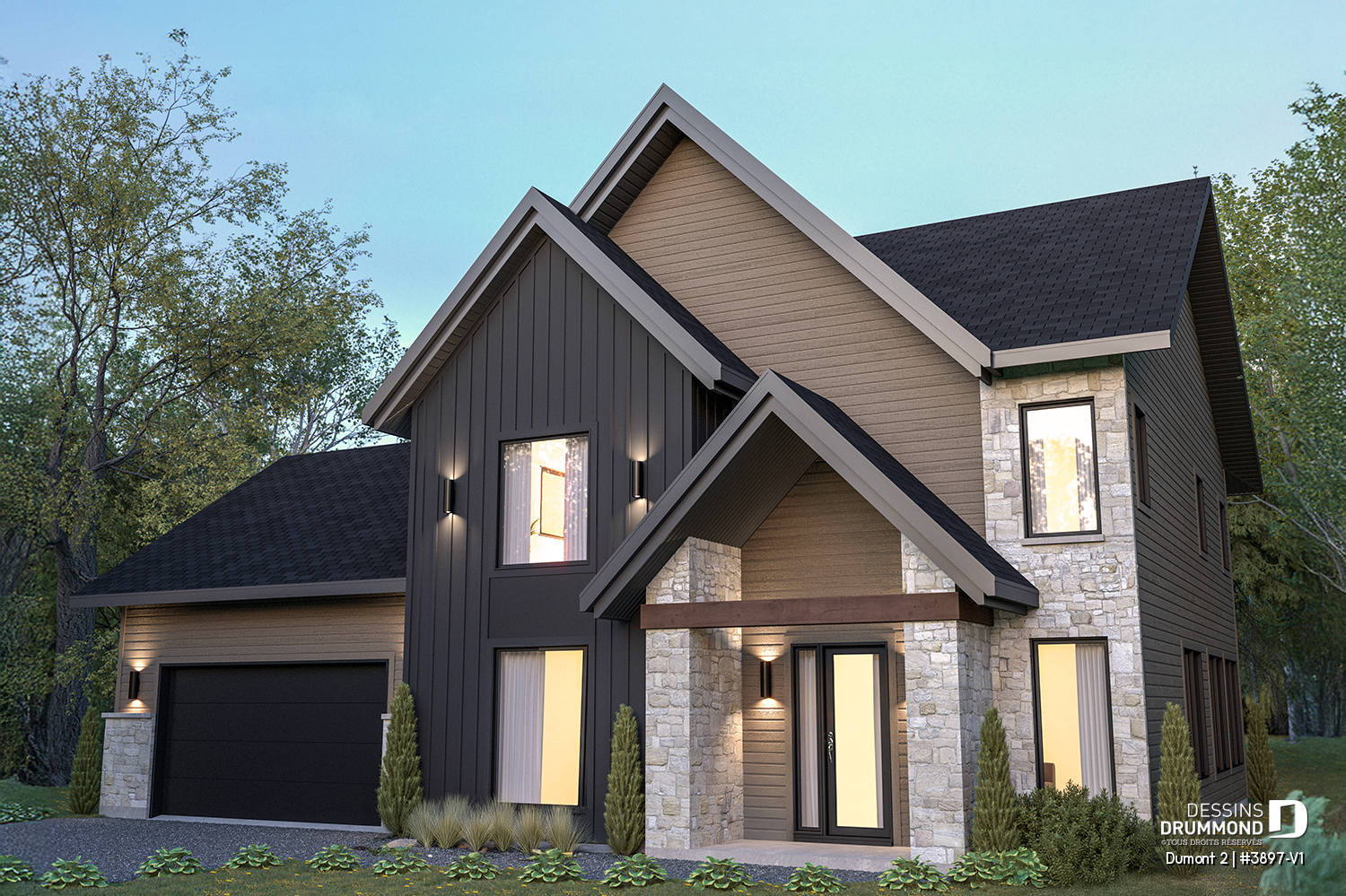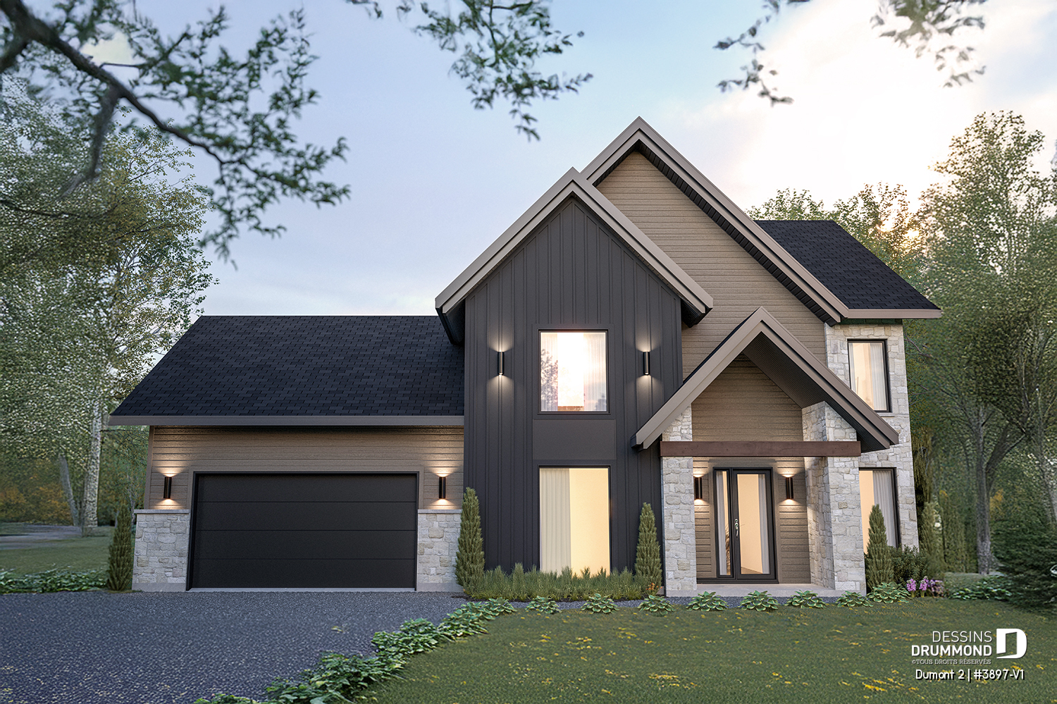 Les estimations de maison incluent les revêtements tels qu'illustrés sur notre site. Les maisons modestes sont calculées avec un revêtement de clin régulier en vinyle. Pour les maisons régulières et plus complexes, nous ajoutons des montants approximatifs (au pi.ca.) : clin de fibrociment, de cèdre, maçonnerie légère ou régulière (partiel ou total), board & batten, bois, et autres. Les poutres de bois illustrées sur l'extérieure de nos maisons sont aussi incluses dans le coût, mais elles sont «capées » et non en bois massif. Il en est de même pour les portes d'entrée et portes de garage. Elles sont incluses aux estimations, mais de qualité standard. Concernant les revêtements de maçonnerie : on propose, sur plusieurs modèles, une touche de brique-pierre comme on en retrouve chez la plupart des fabricants de brique (faire attention de ne pas confondre avec de la pierre naturelle, rarement sur nos illustrations et beaucoup plus dispendieuse). NOTE : Si vous souhaitez utiliser un revêtement de maçonnerie plutôt qu'un clin comme illustré sur le plan que vous avez choisi, svp nous contacter car vous aurez besoin de faire modifier le plan en conséquence.
